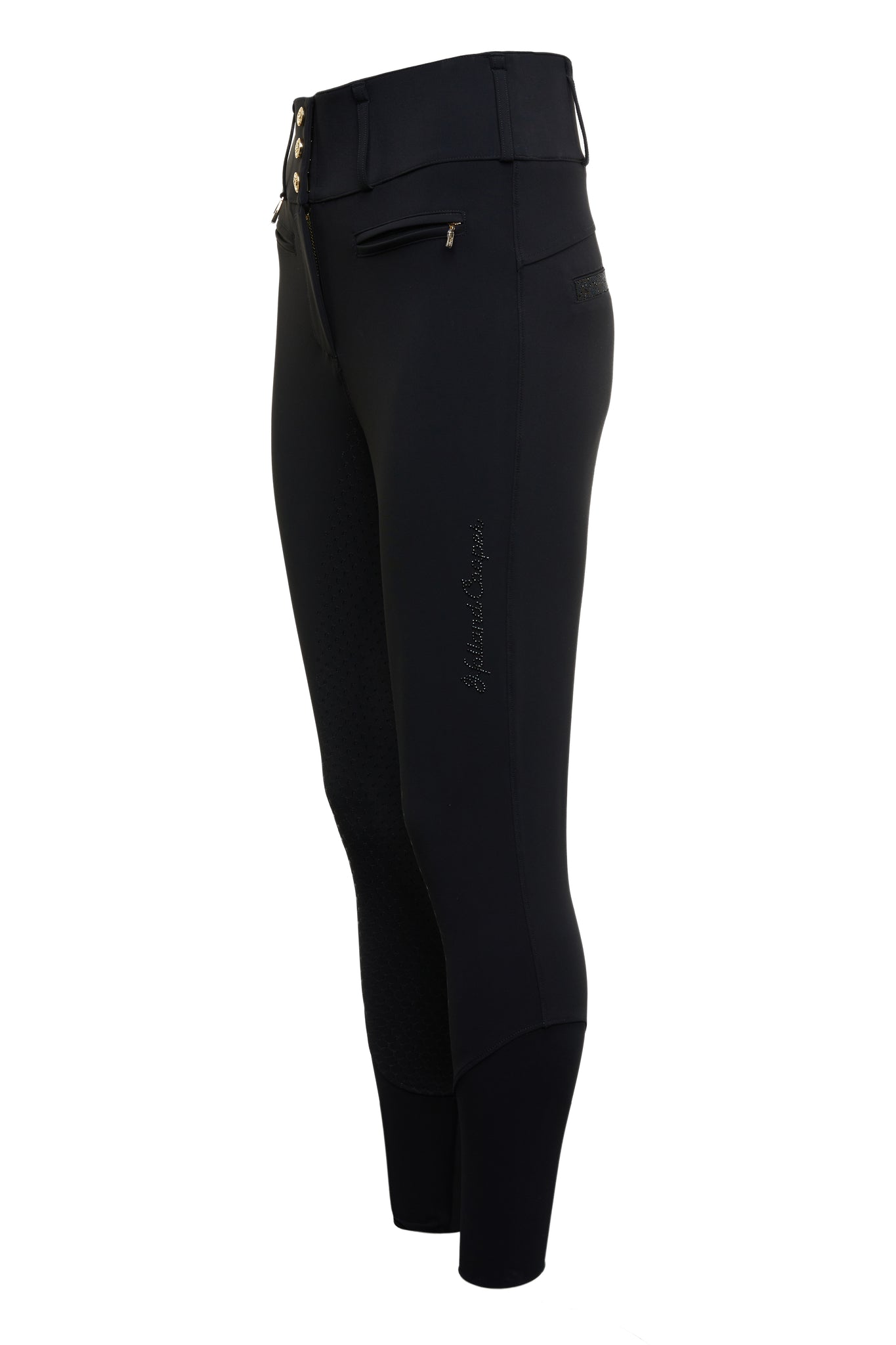 Designed with all riders in mind, our Premium High Rise Breeches will ensure maximum movement and comfort in and out of the saddle. High-rise and perfectly tailored from a breathable 4-way stretch fabric with a Teflon® coating for a super comfortable second skin feel. Designed with practical lower-leg jersey panels, reducing bulk and increasing comfort when wearing riding boots. Fit with Framilon grip tape applied to inner waistband to prevent shirts from riding. Embellished with Swarovski® crystals on the logo and pockets, combining technical performance and style.