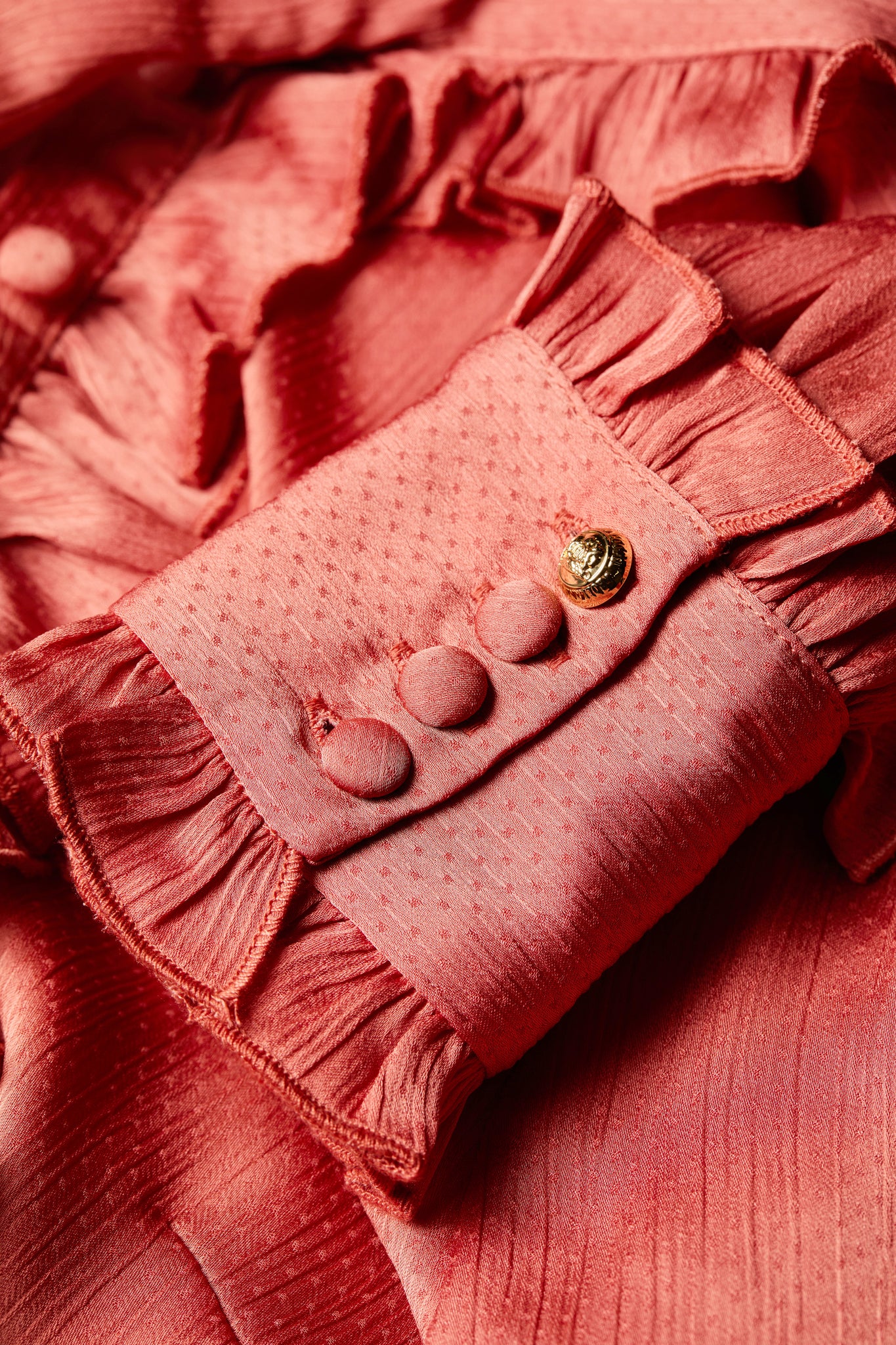 - 3/4 ruffle placket down CF with self cover buttons