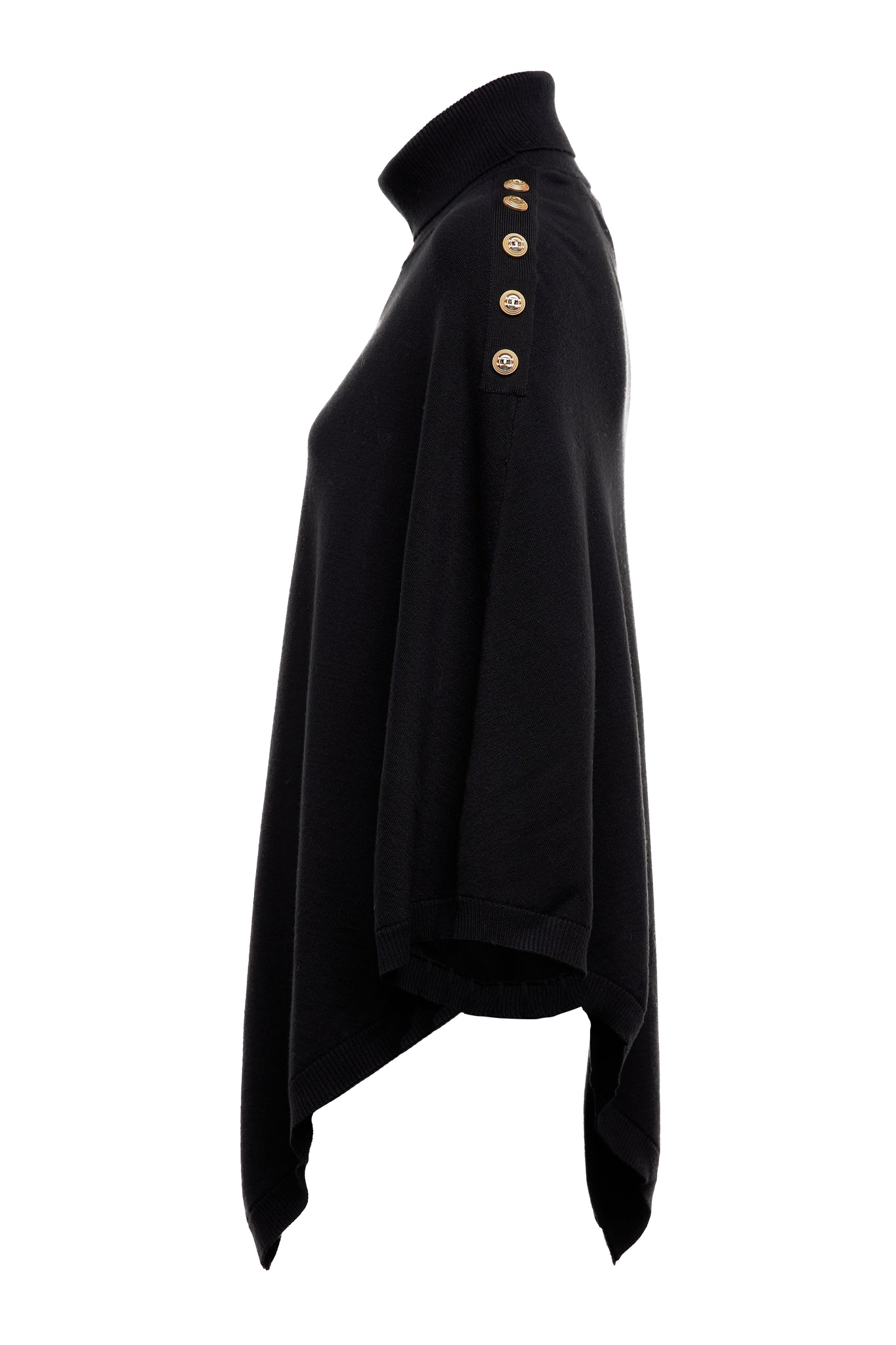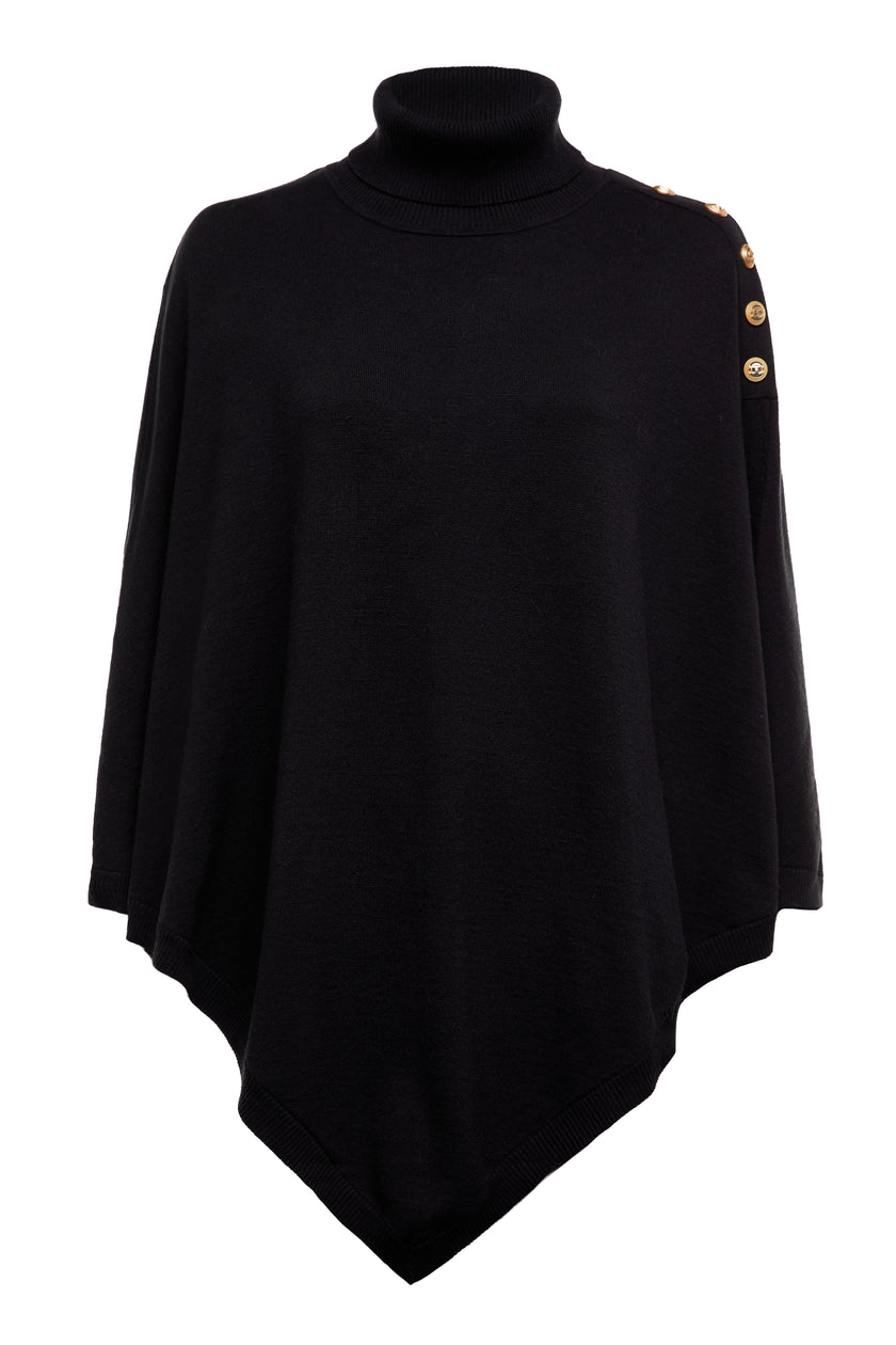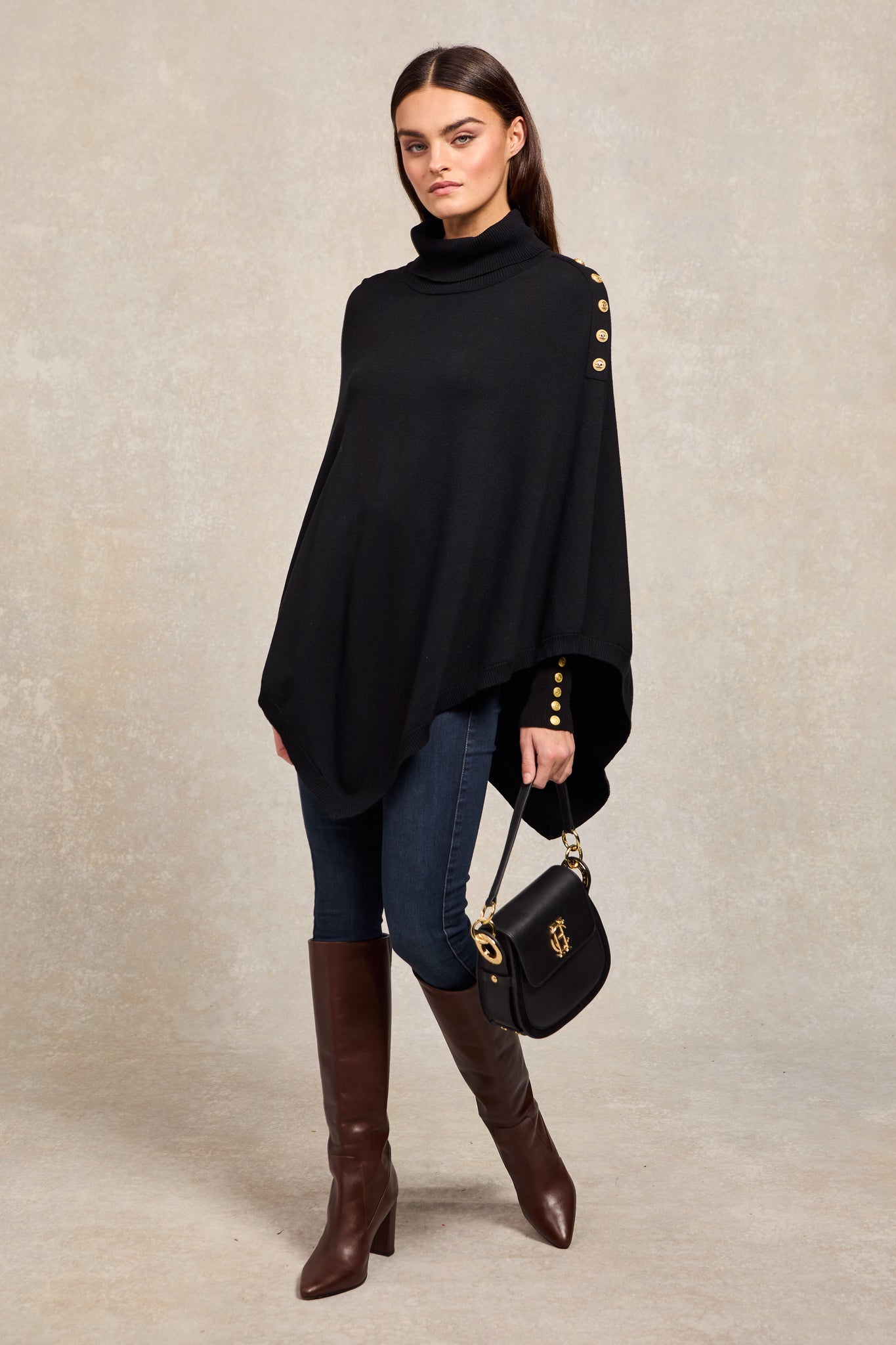 Minimalist and stylish, this roll-neck cape pairs perfectly with every outfit. Super soft and lightweight, this cape can be easily worn over everything from shirts to dresses. Featuring an asymmetric back and front with our iconic gold hardware to one shoulder.