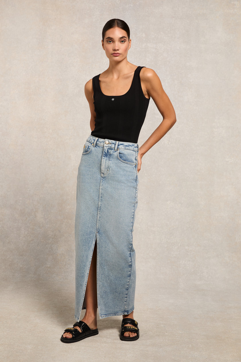 This vest offers a figure-hugging silhouette that accentuates the natural contours of your body. The natural black hue brings a fresh and versatile appeal, making it a perfect staple for any wardrobe. The vest features a sophisticated variegated rib knit that adds texture and depth to the design, while the high-build embroidery along the neckline introduces a touch of artisanal charm. Each strap is adorned with a unique rope-style rivet, providing a nautical twist that complements the overall aesthetic.