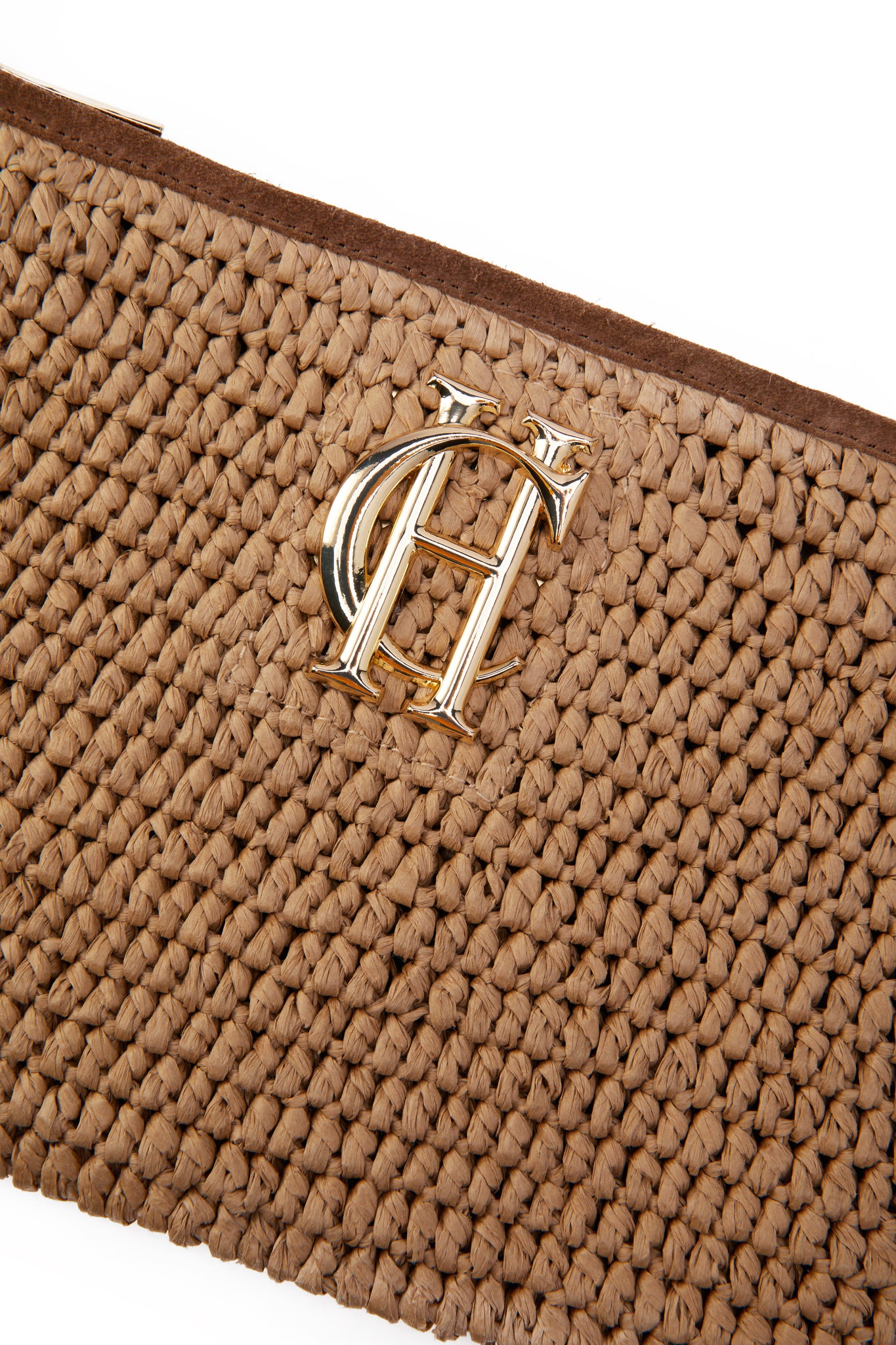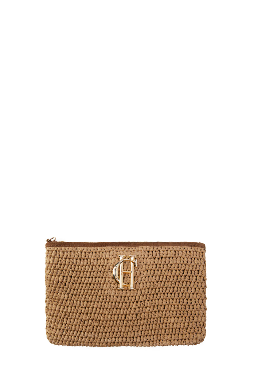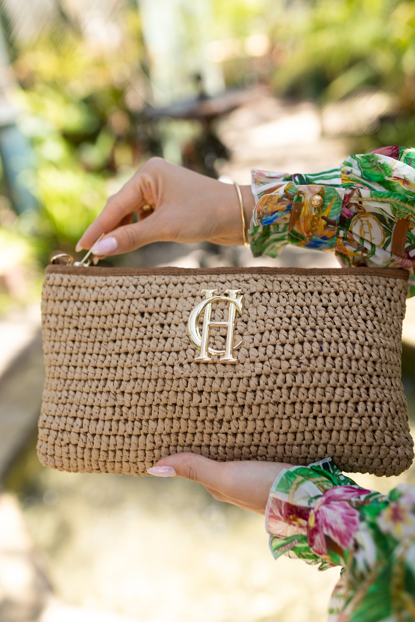 Crafted from natural raffia and a leather binding, this bag carefully plays with texture. Fastened with a gold zip and adorned with our iconic gold HC branding on the front this clutch is the perfect summer accessory. Match it with our Riviera tote bag for the perfect summer pairing.