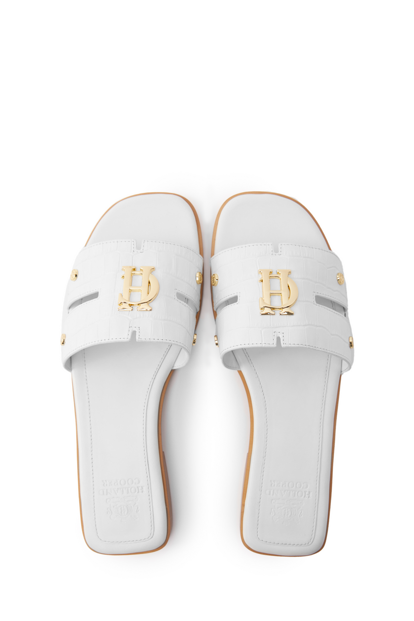 Meet our new shade of Monogram Slides, White Croc, the perfect accompaniment for summer. Designed with a cushioned sole for comfort, soft leather strap and eye catching cut out detail. This slide is adorned with our signature HC Monogram and gold rivets.