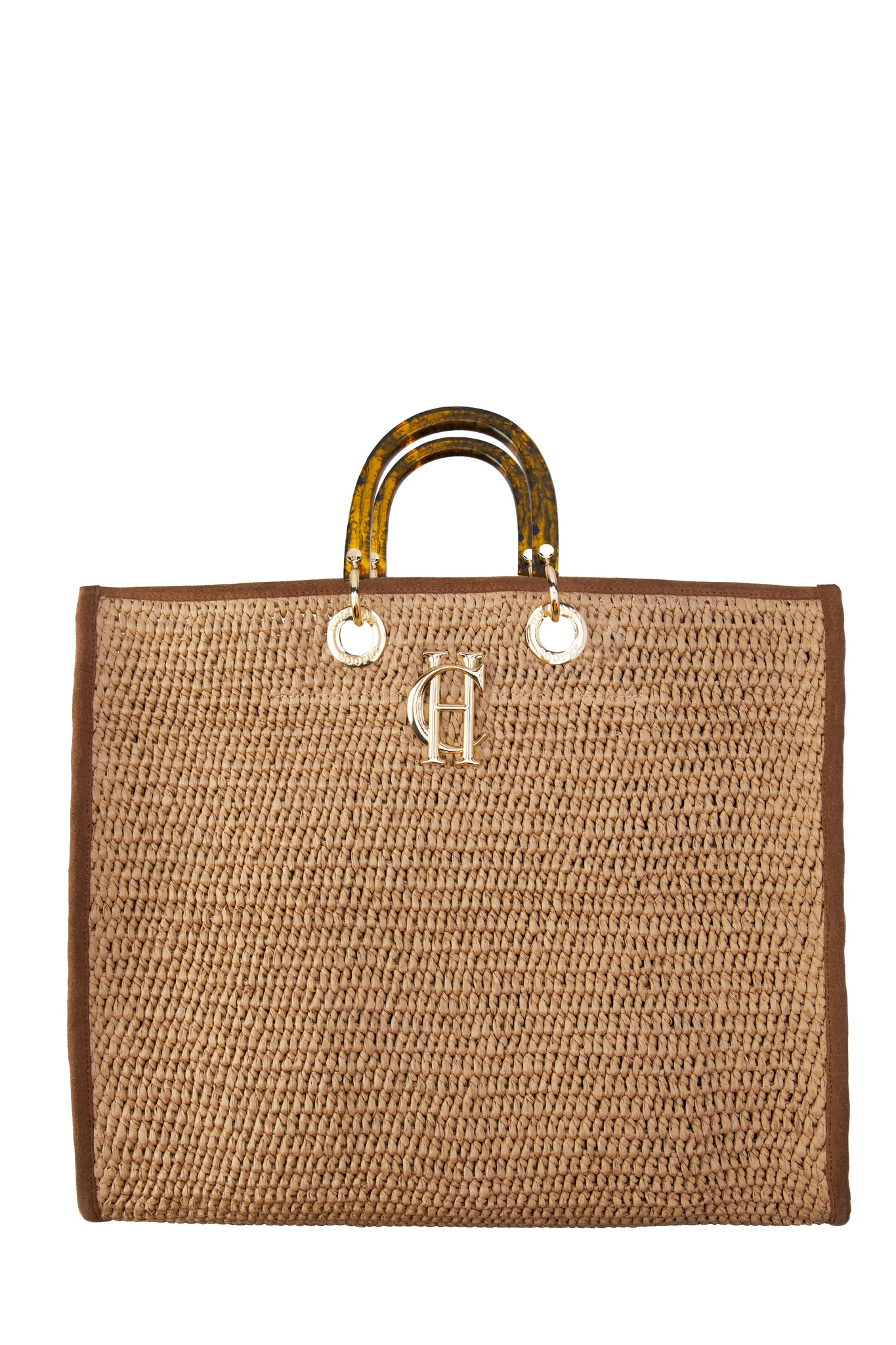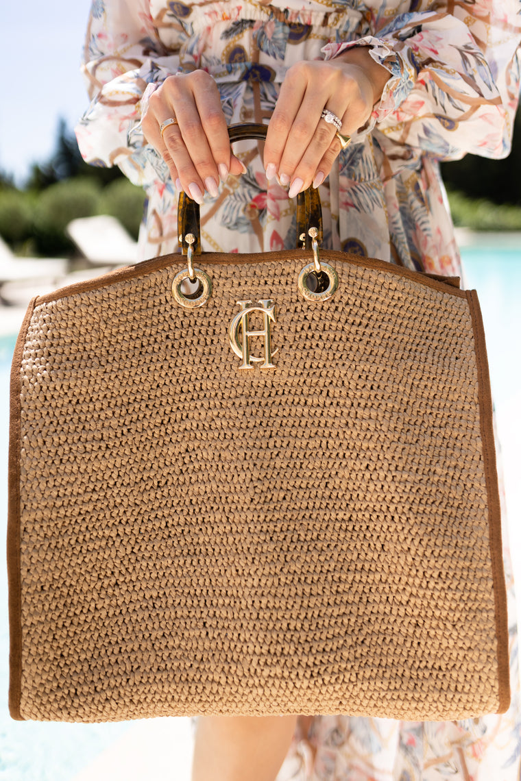 The ultimate summer companion, this tote is meticulously made from natural raffia with leather binding for added structure. Featuring our iconic gold HC hardware on the front and a tortoiseshell top handle, this bag is made to perfectly carry all of your needs. Match with our matching Riviera clutch for the perfect summer pairing.