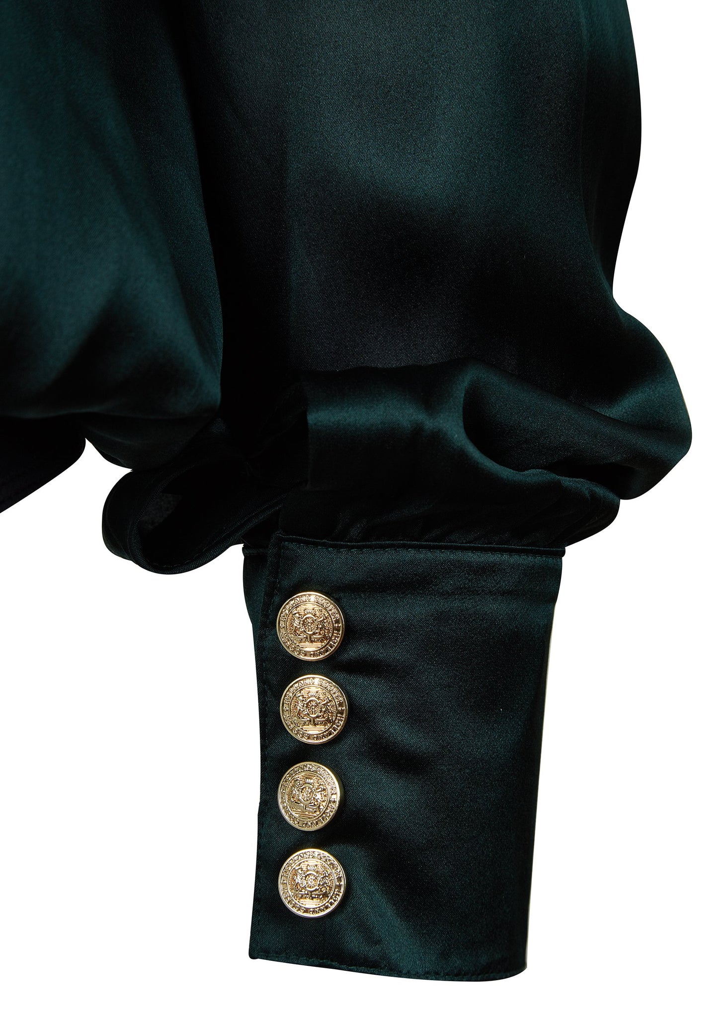 button detail on womens long sleeve silk dark green wrap front bodysuit with gold buttons