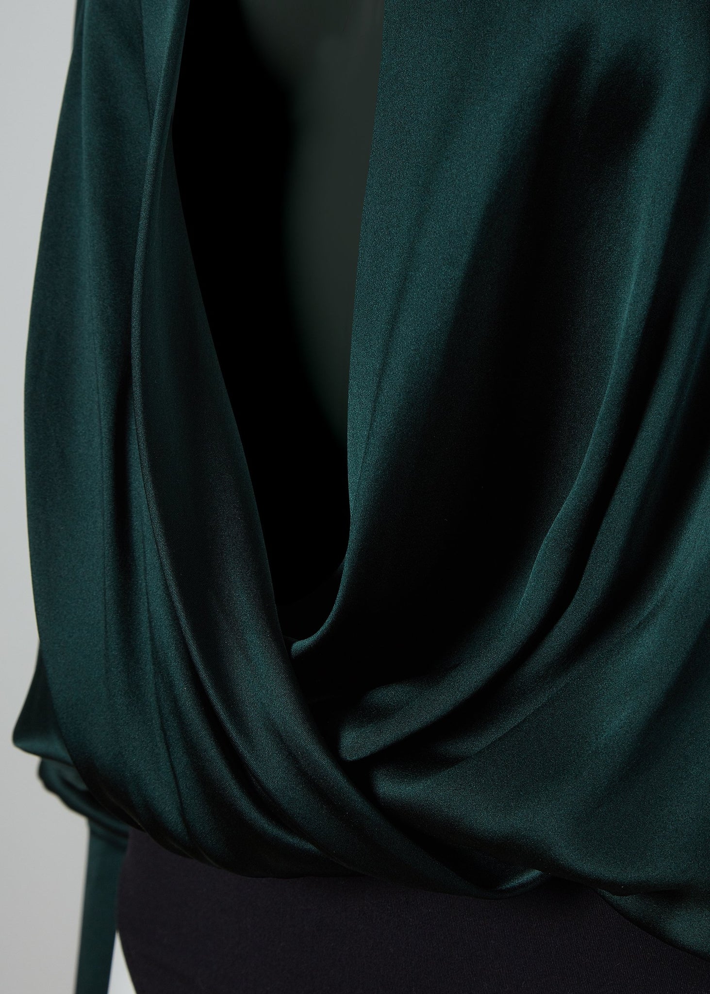 back of womens long sleeve silk dark green wrap front bodysuit with gold buttons
