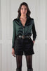 gold button shoulder detail on womens long sleeve dark green silk v neck blouse with gold buttons