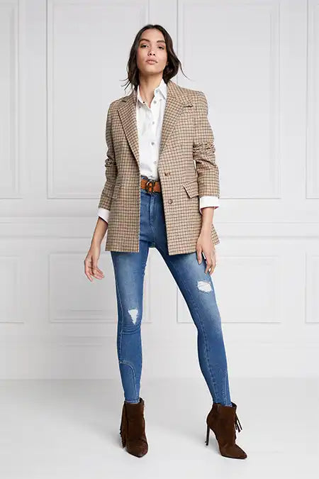 This is a modern and elegant version of a traditional country-style blazer. Made from durable, British-made wools and trimmed with authentic suede. Complete with stretch lining for extra movement, single back vent, storm collar tab and trimmed with branded HC faux horn buttons. Wear it solo or layered over one of our shirts or signature pieces of knitwear. This product has been hand cut and made entirely in the UK.