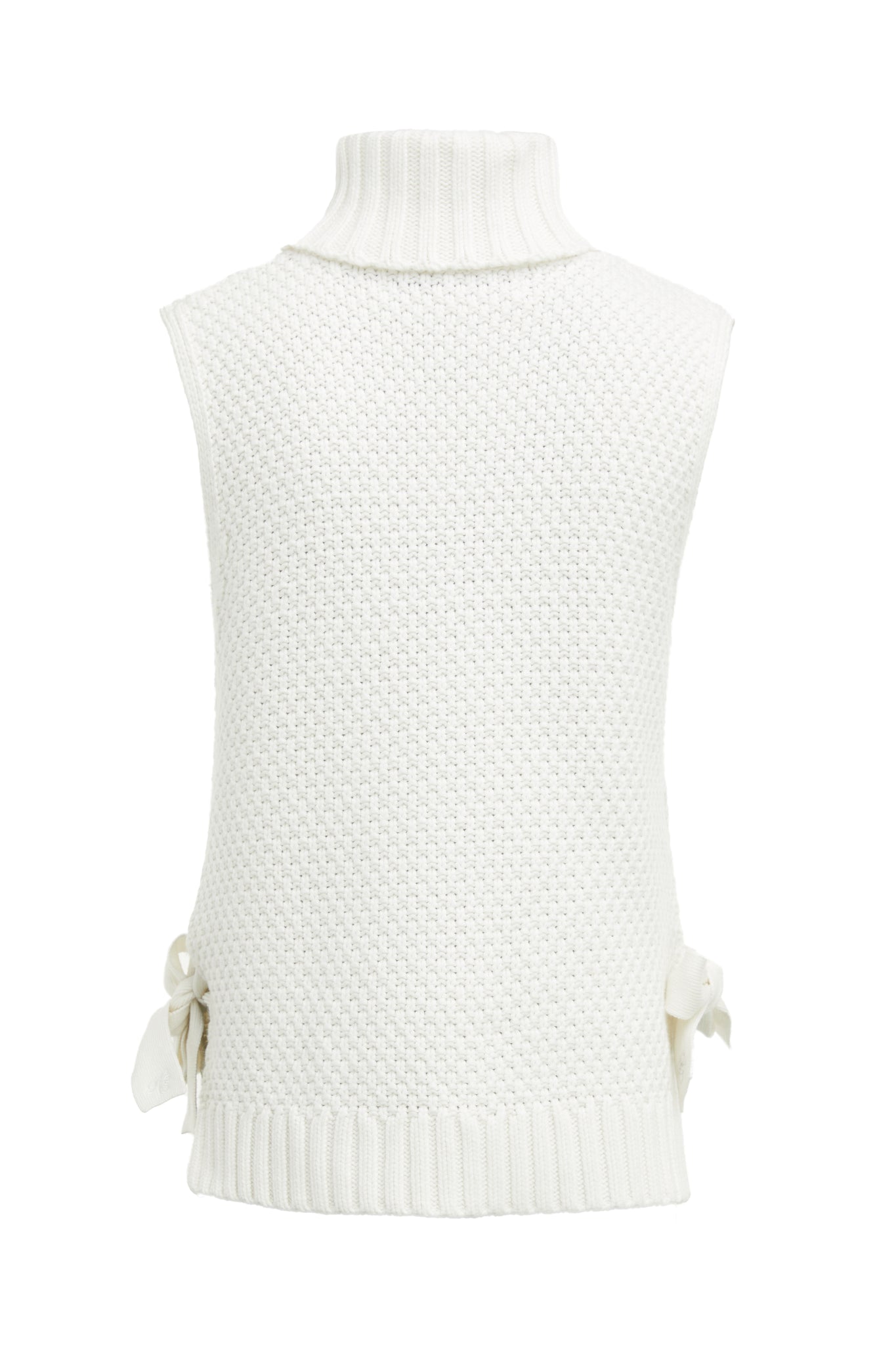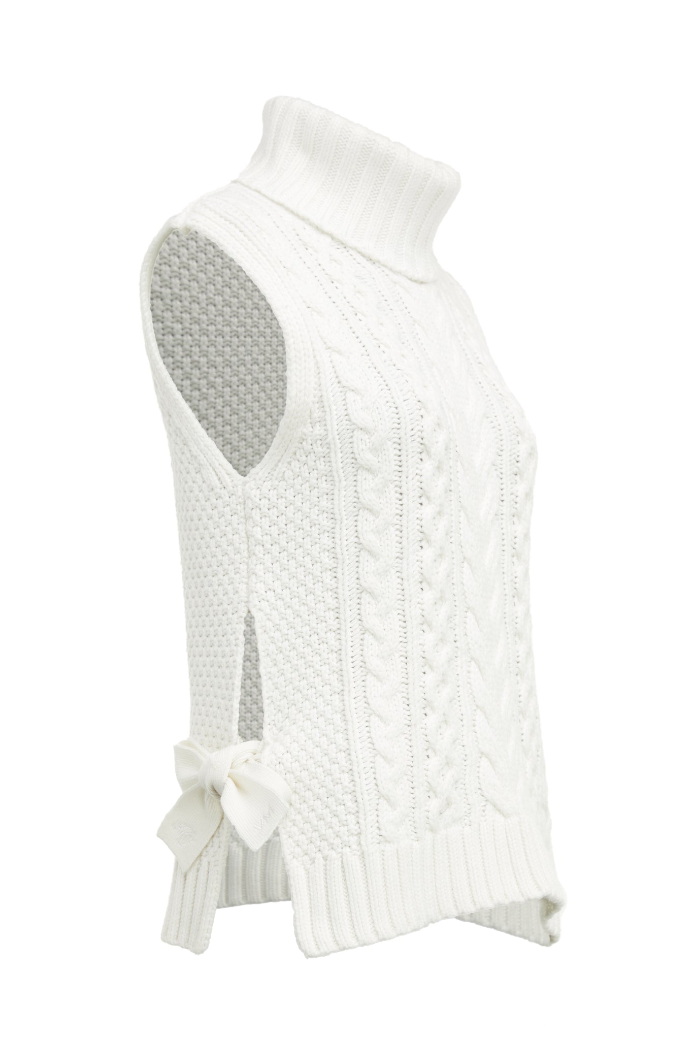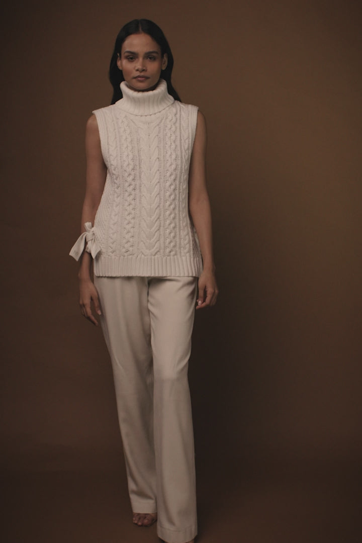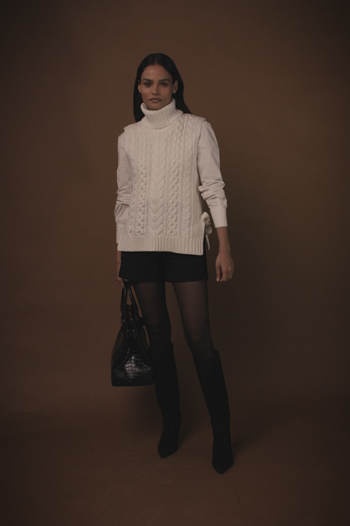 Created with a chunky cable knit made from a super soft yarn, this sleeveless knit is the ultimate layering piece for your wardrobe. Designed with ties at the side that can be worn done up or undone and thick ribbed hem detailing. Layer yours over our classic white shirt.