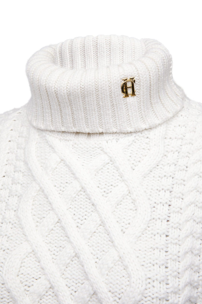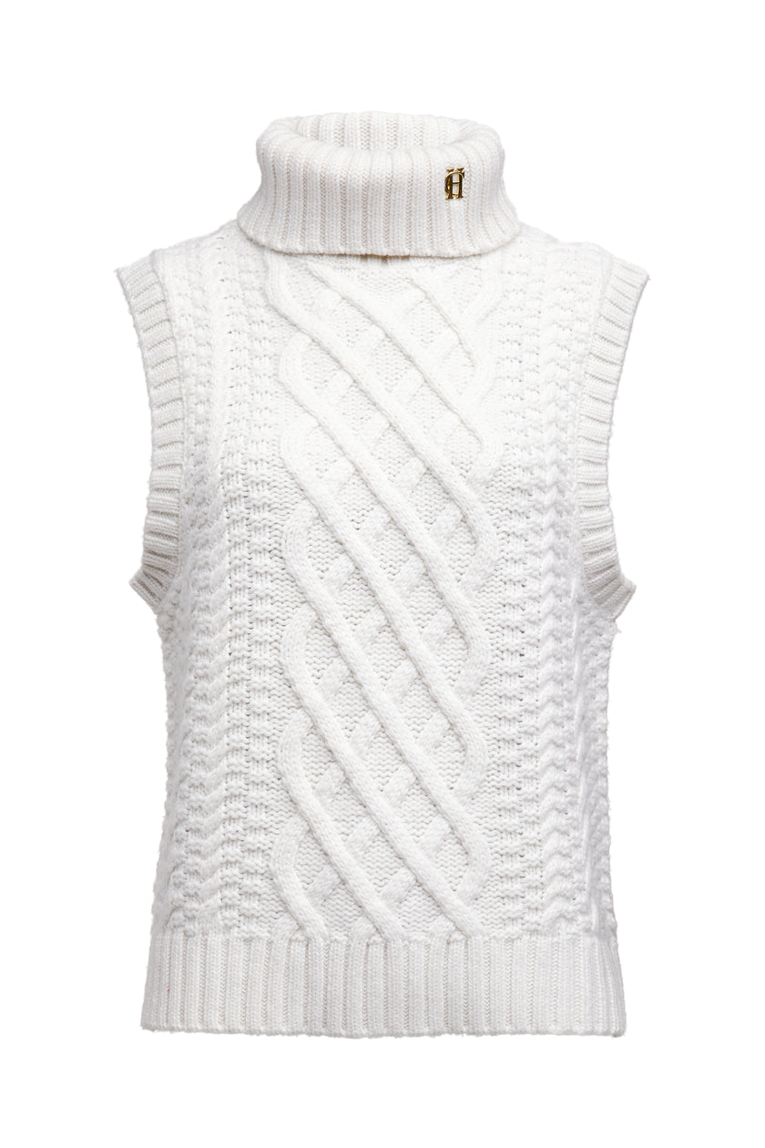 The ultimate layering piece, this sleeveless jumper is a must-have for every women's wardrobe. Made from a super soft wool blend, this knit features a classic cable knit to the body and flattering ribbed roll neck. Finished with our iconic HC pin placed on the roll neck, this piece pairs great over a classic white shirt.