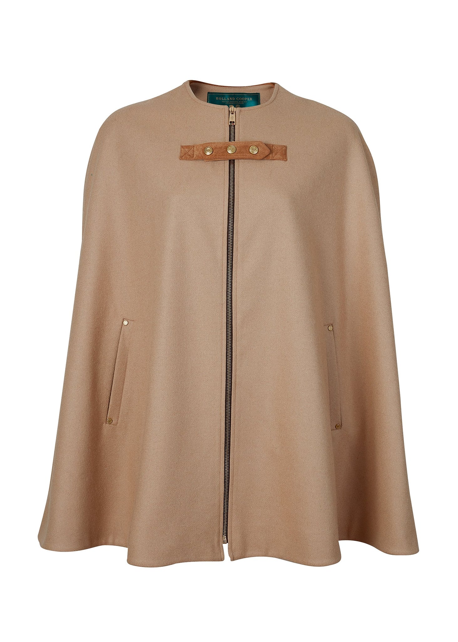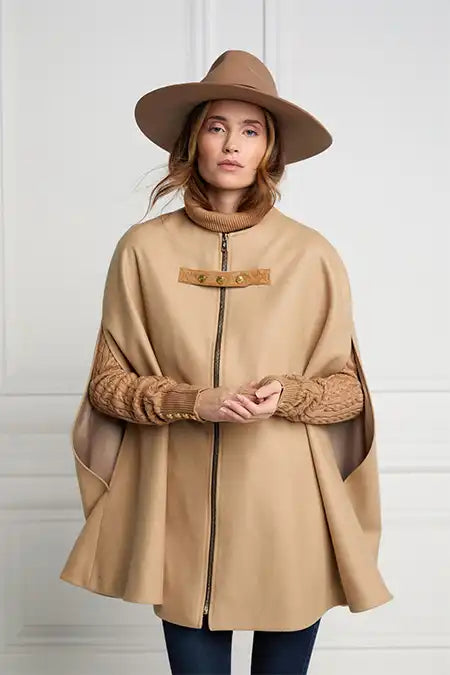This elegant cape is made from British wools and trimmed with authentic suede. The close fit across the shoulders ensures comfort and ease of movement. This product has been hand cut and made in England.