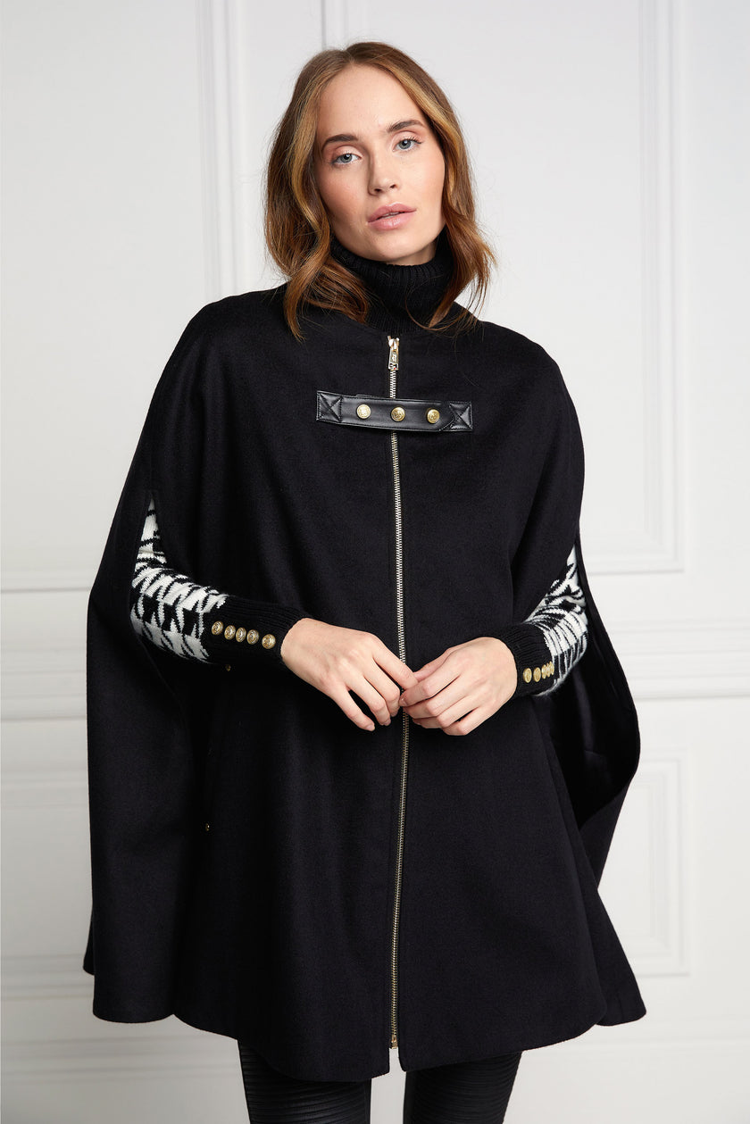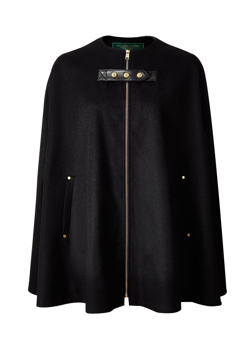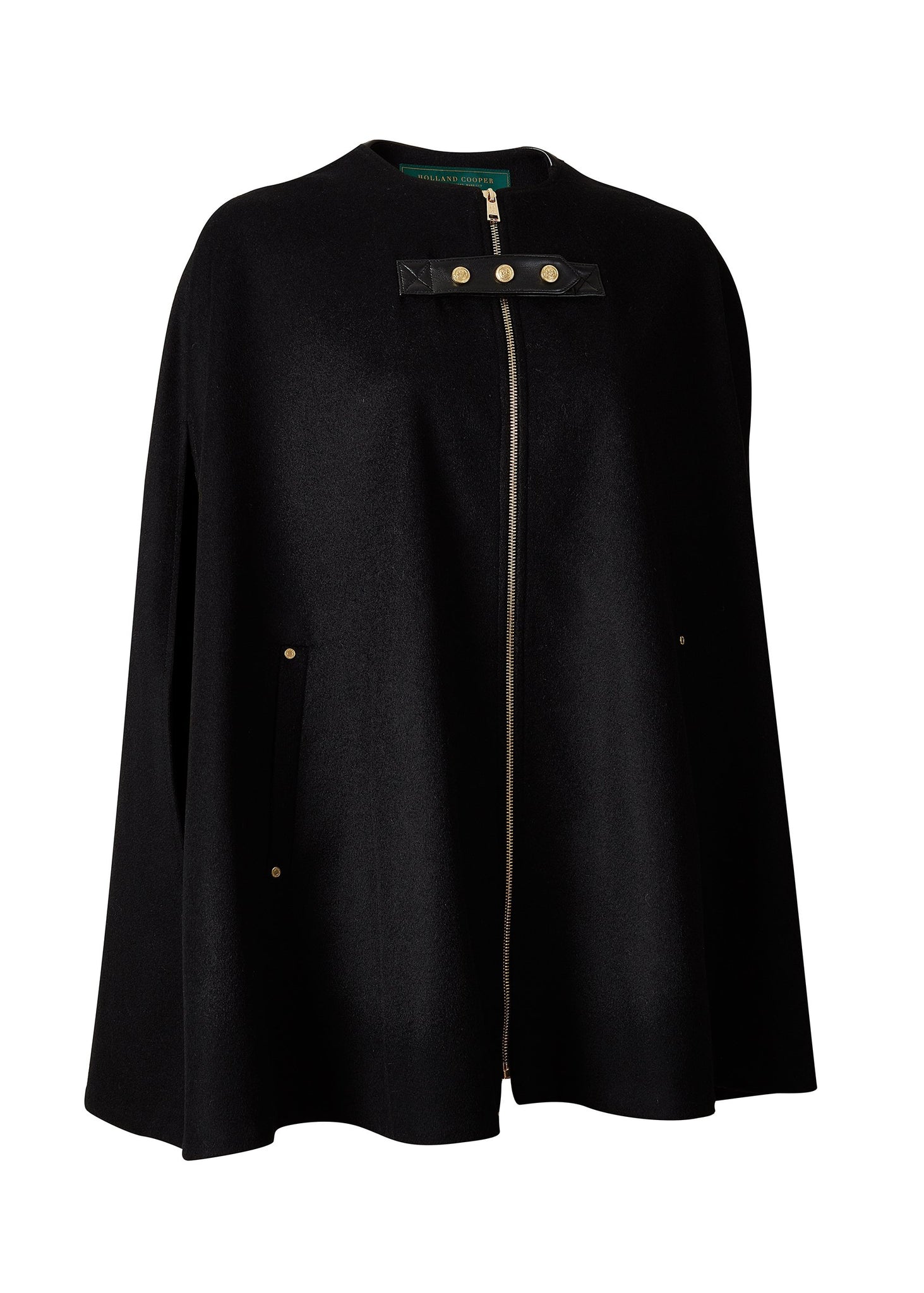This elegant cape is made from British wools and trimmed with authentic leather. The close fit across the shoulders ensures comfort and ease of movement. This product has been hand cut and made in England.
