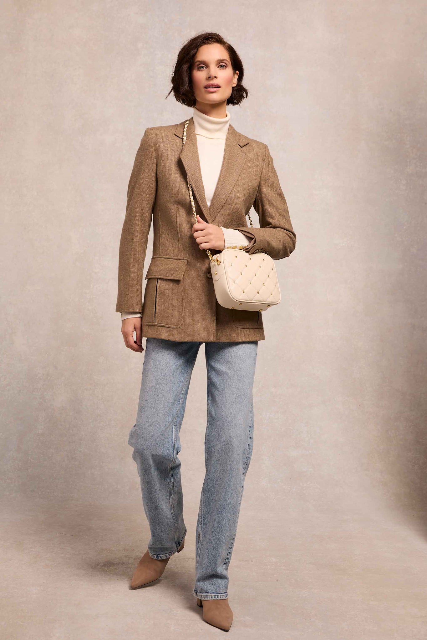 Masterfully crafted from premium leather, this sophisticated accessory showcases our signature design elements with meticulous attention to detail. One side features our distinguished HC rivet, while the other boasts luxurious quilting adorned with micro HC studs – a perfect marriage of classic elegance and contemporary style. The leather-wrapped chain strap adds a touch of refined glamour, while the branded base rivets reinforce our commitment to excellence. Lined with soft cotton for practicality, this versatile piece seamlessly transitions from day to evening.