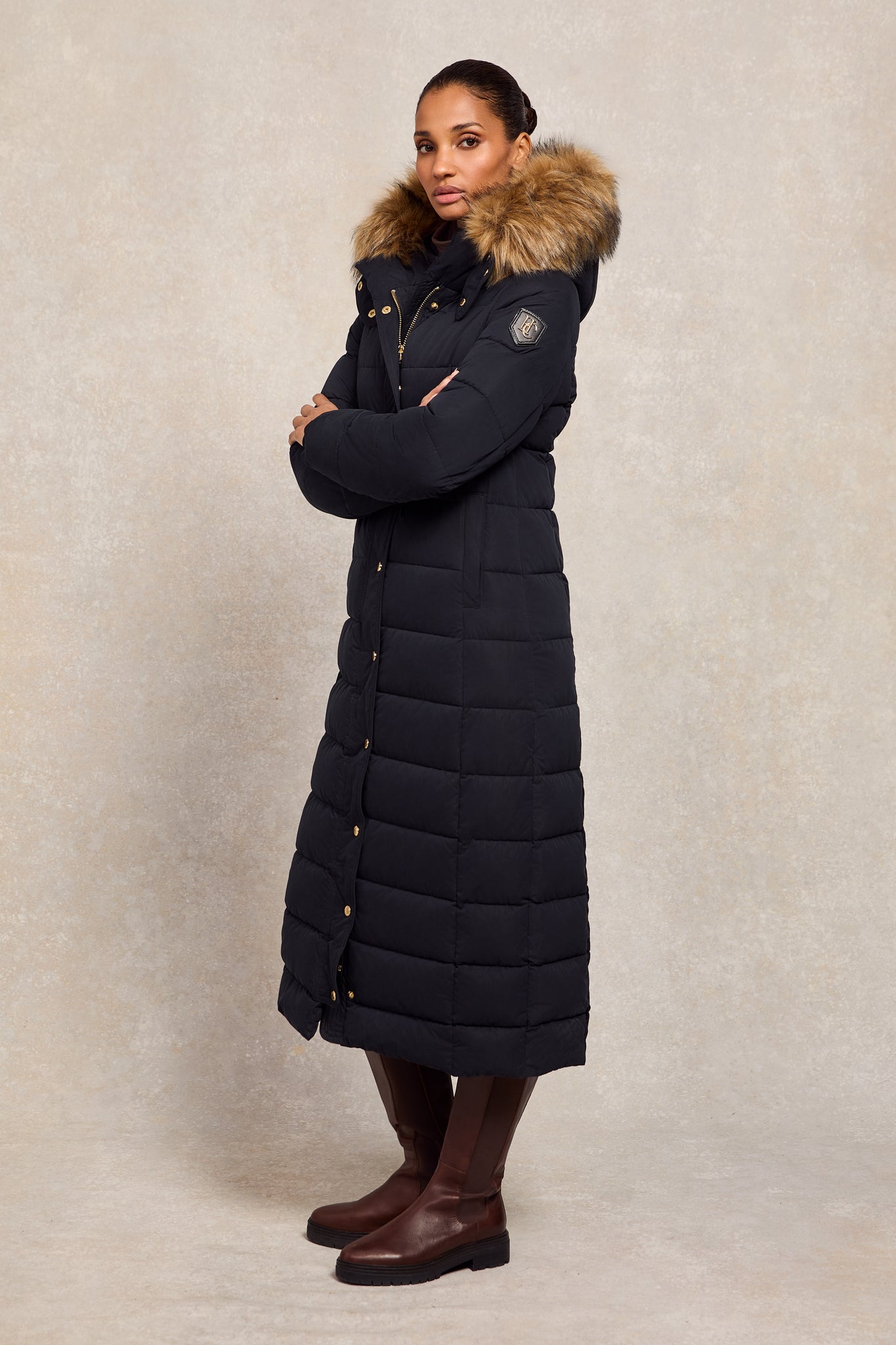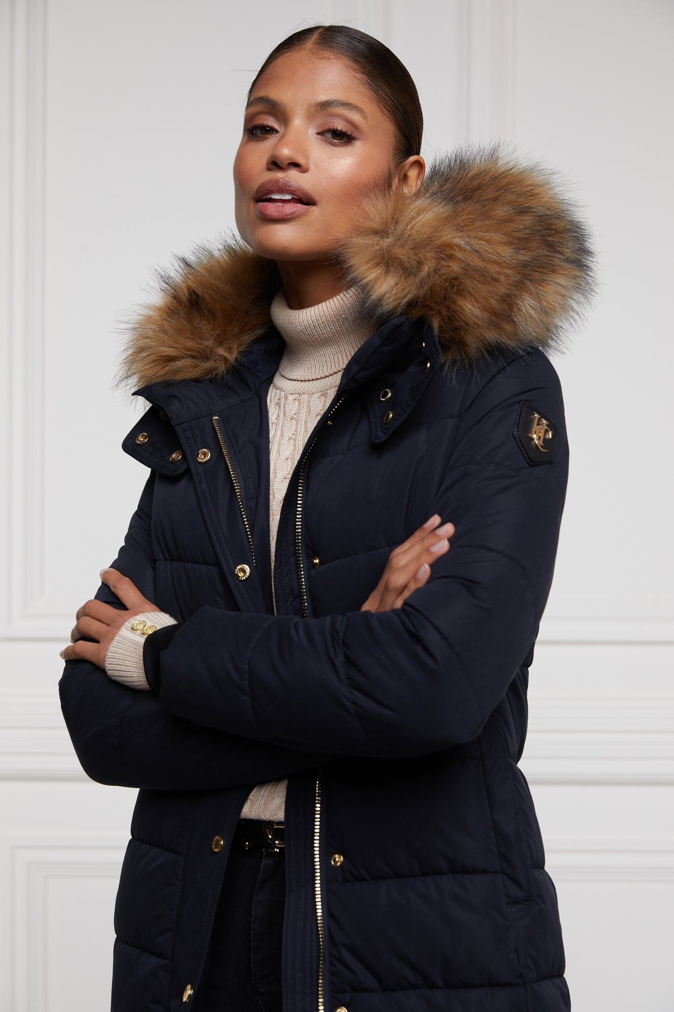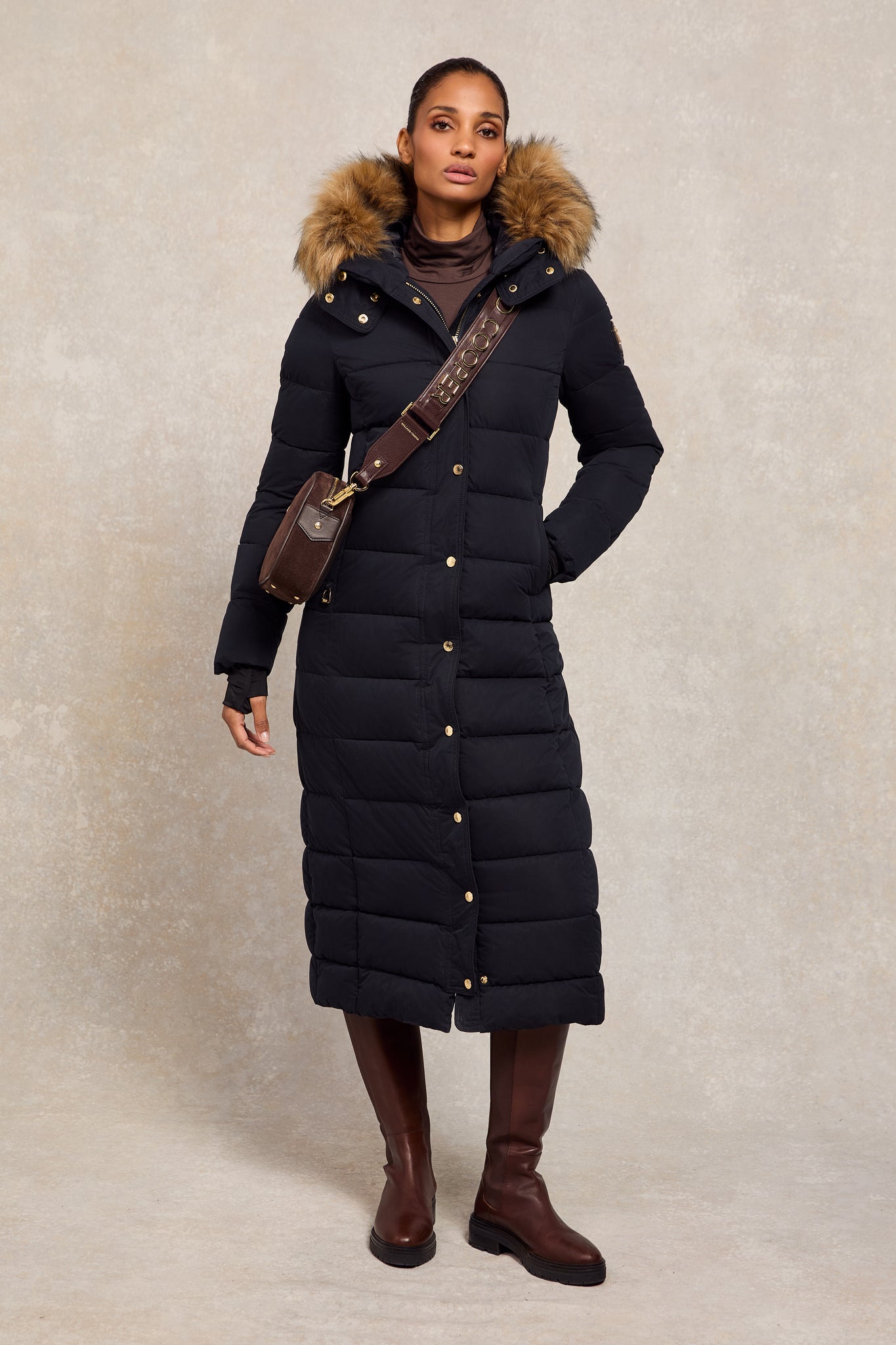 Designed with a longline silhouette and slim fit, the Stoneleigh Longline Coat has been meticulously crafted to ensure style, warmth and practicality. With a detachable faux fur hood collar, neoprene storm cuffs and eco-fill, this piece is ideal for chilly winter days whilst ensuring you still look put together. Finished with our iconic HC hardware and tonal embroidery. -