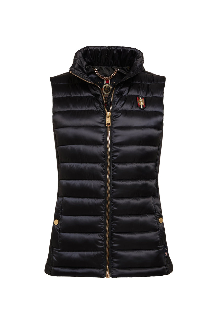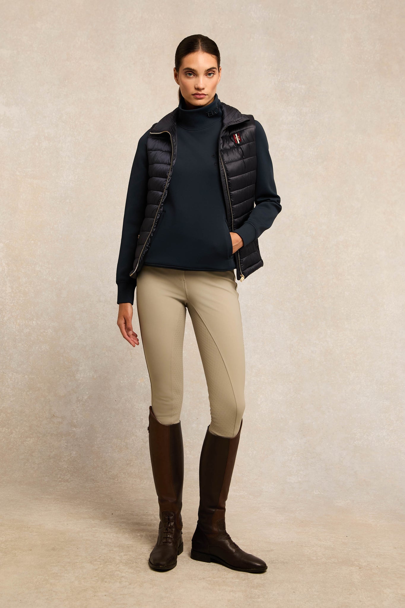 Meticulously crafted from premium technical fabric, this sleek gilet offers exceptional versatility for year-round wear. The streamlined silhouette features elasticated shirring at the sides, ensuring a tailored fit while maintaining freedom of movement. Adorned with our signature high-density embroidery and luxurious gold hardware, this piece exemplifies Holland Cooper's dedication to quality and style. Practical snap-closure welt pockets complete this essential layer. Perfect for both the stables and country pursuits.