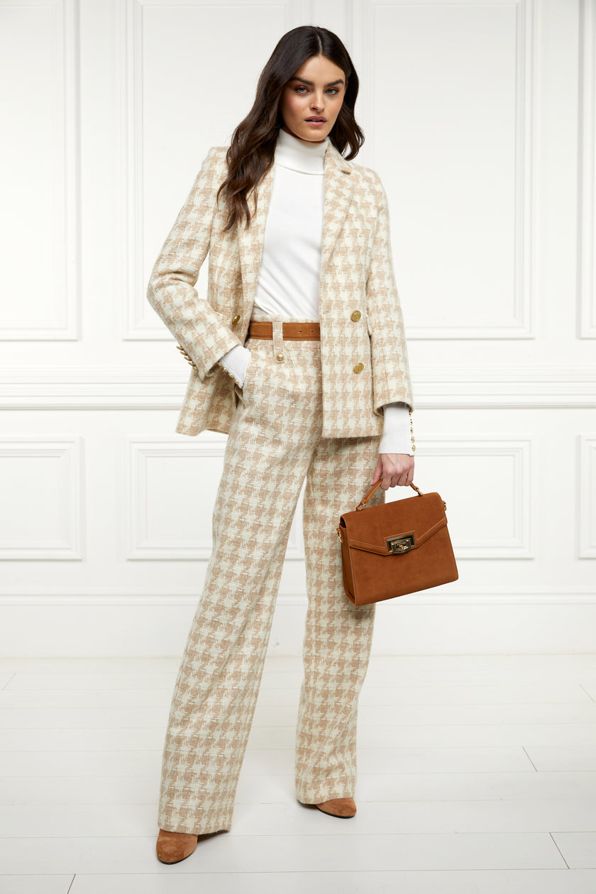Simple and refined, these wide-leg trousers are the perfect balance of smart and casual that effortlessly take you from day to night. Made from a luxurious wool blend that's fully lined, these trousers sit high on the waist with a wide waistband to create a flattering silhouette that suits all body shapes. Featuring two large side pockets and adorned with our iconic gold hardware for an added touch of luxury. These trousers have been hand cut and made in England using wool woven in the UK.