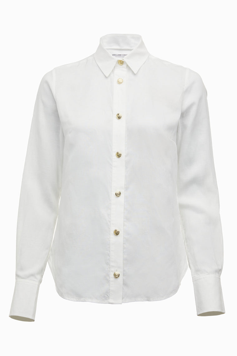 A beautifully relaxed fitting classic shirt, perfect for every womans wardrobe, this piece has been elegantly designed with french interior seams and pleated back for volume. Detailed with a single button cuff and signature metal hardware, this shirt is both timeless and versatile.