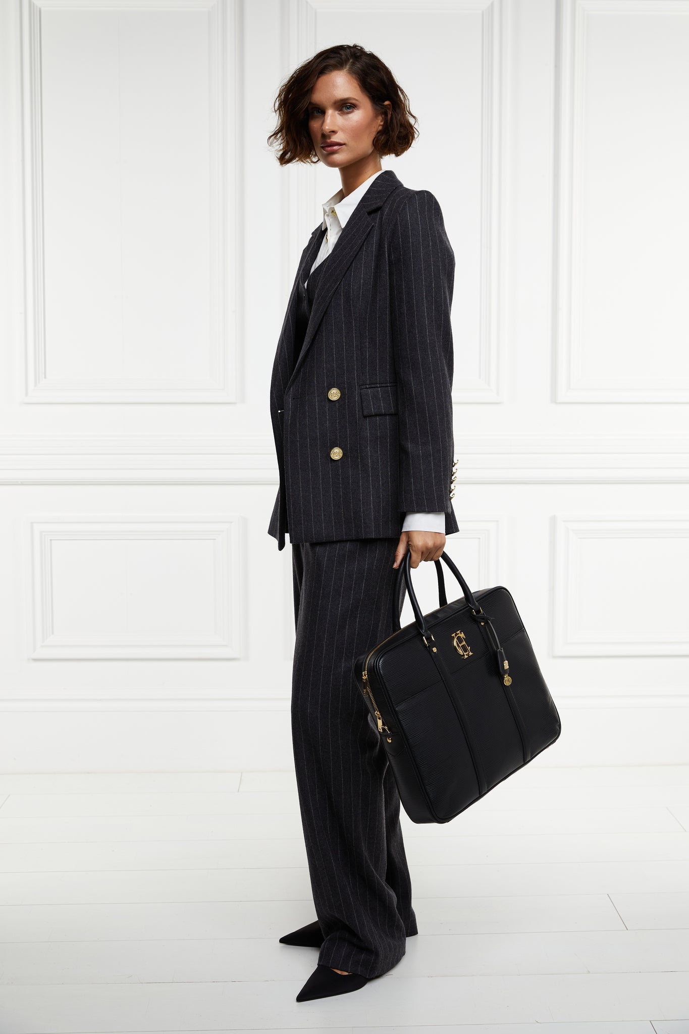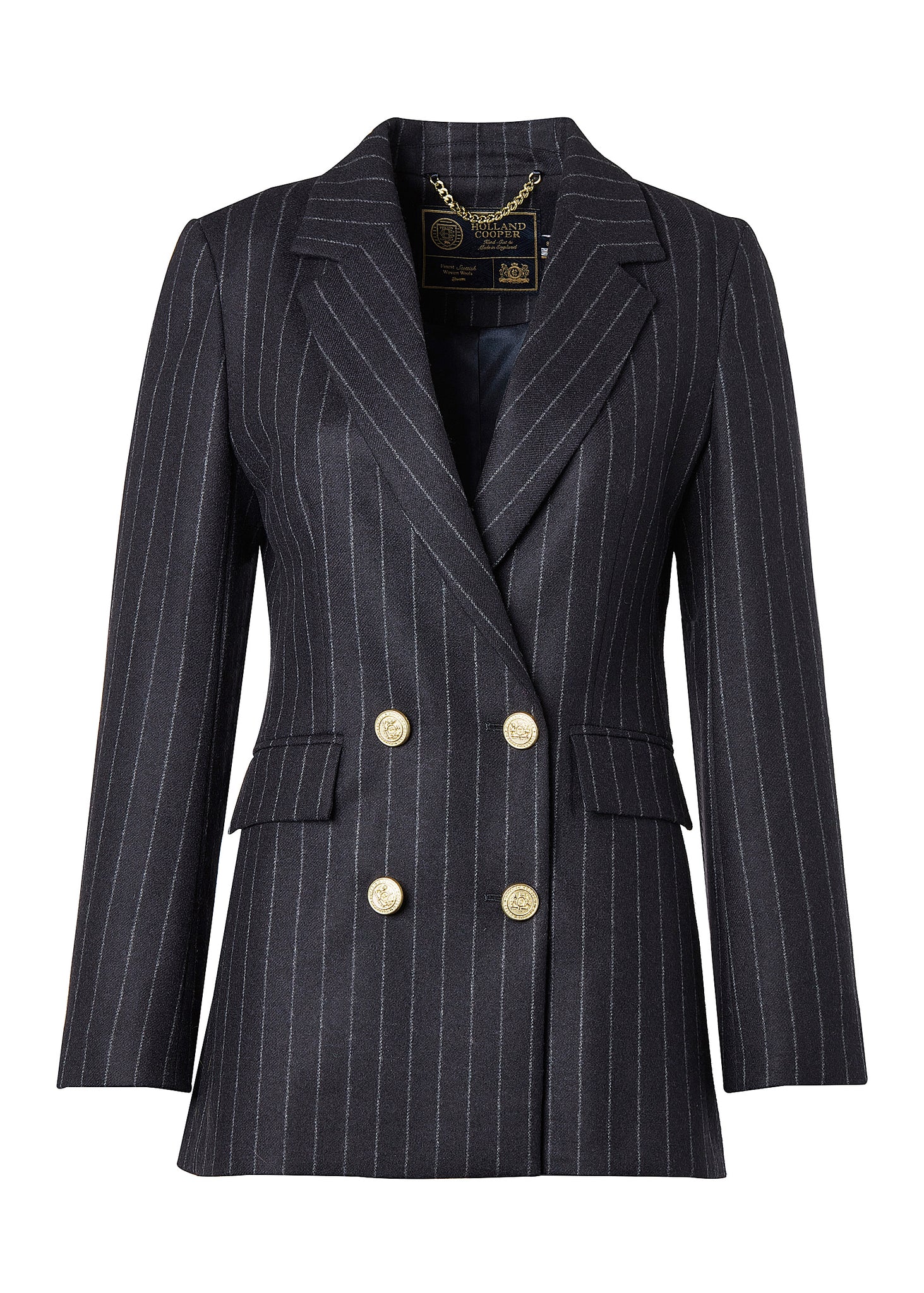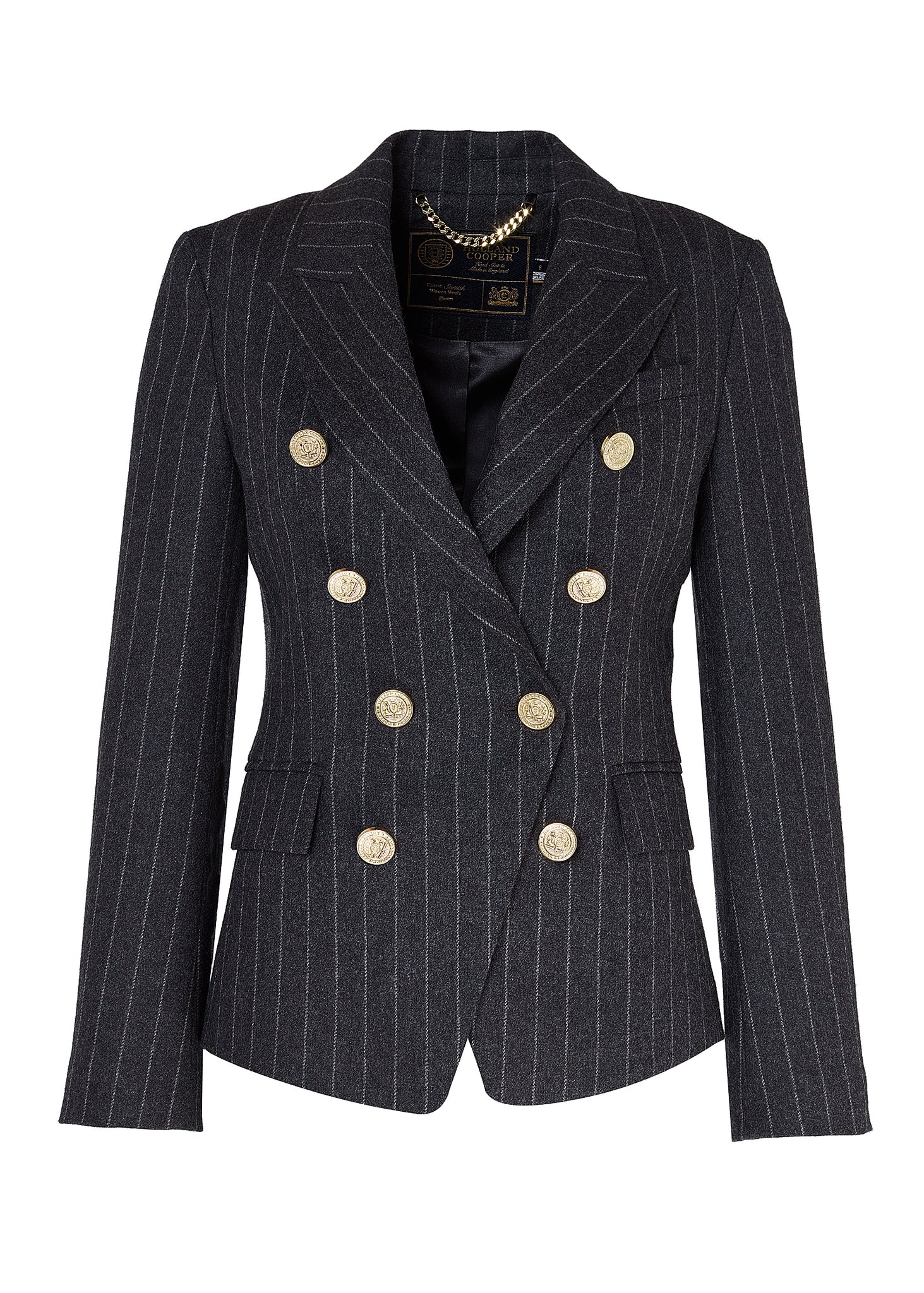 Designed to create a sharp tailored silhouette worn open or closed, the Double Breasted wool Blazer has been handmade in the UK. Crafted from a classic and contemporary pinstripe fabric & fully lined with a luxury stretch lining for extra comfort, this piece is a must-have staple for your wardrobe. With bold lapels & subtle hip pockets, each blazer has been elevated with HC signature gold hardware to the front and cuffs.