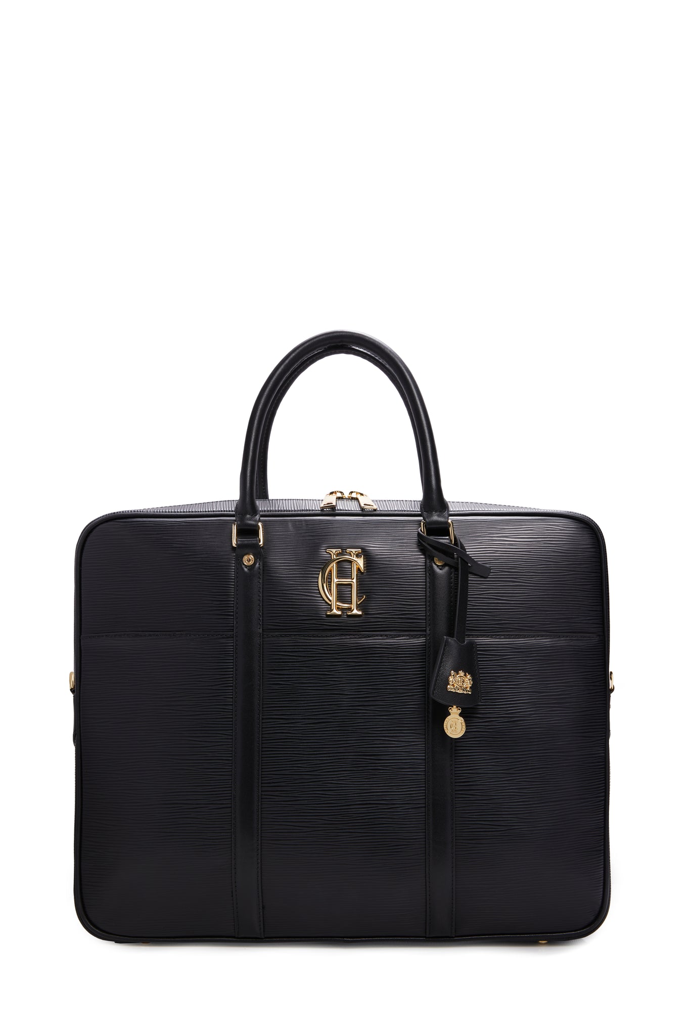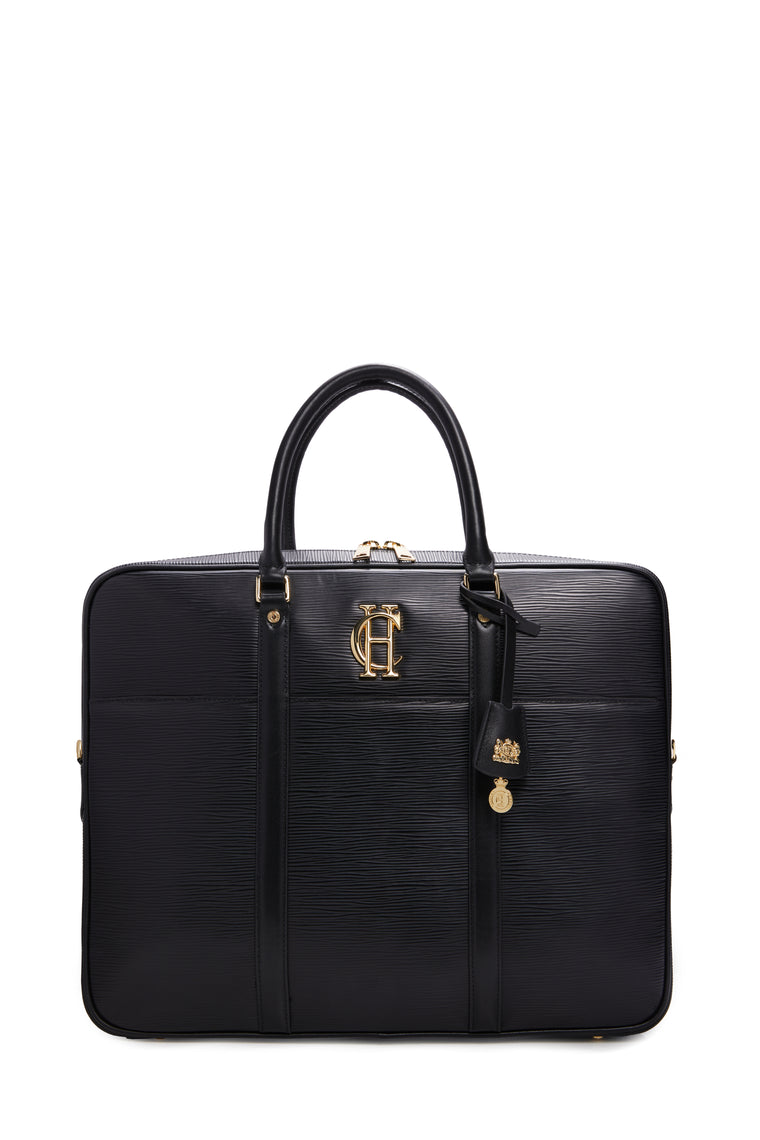 The briefcase is designed with a padded upper for added protection, base rivets for durability, and a gold zip closure. Fully branded with the iconic Gold HC, this briefcase is a sophisticated and practical choice for the modern professional.
