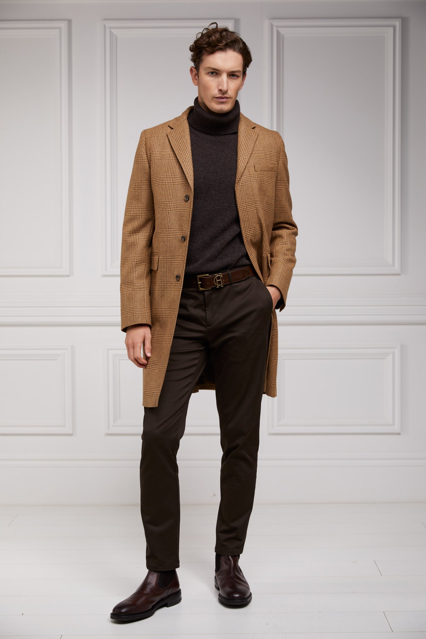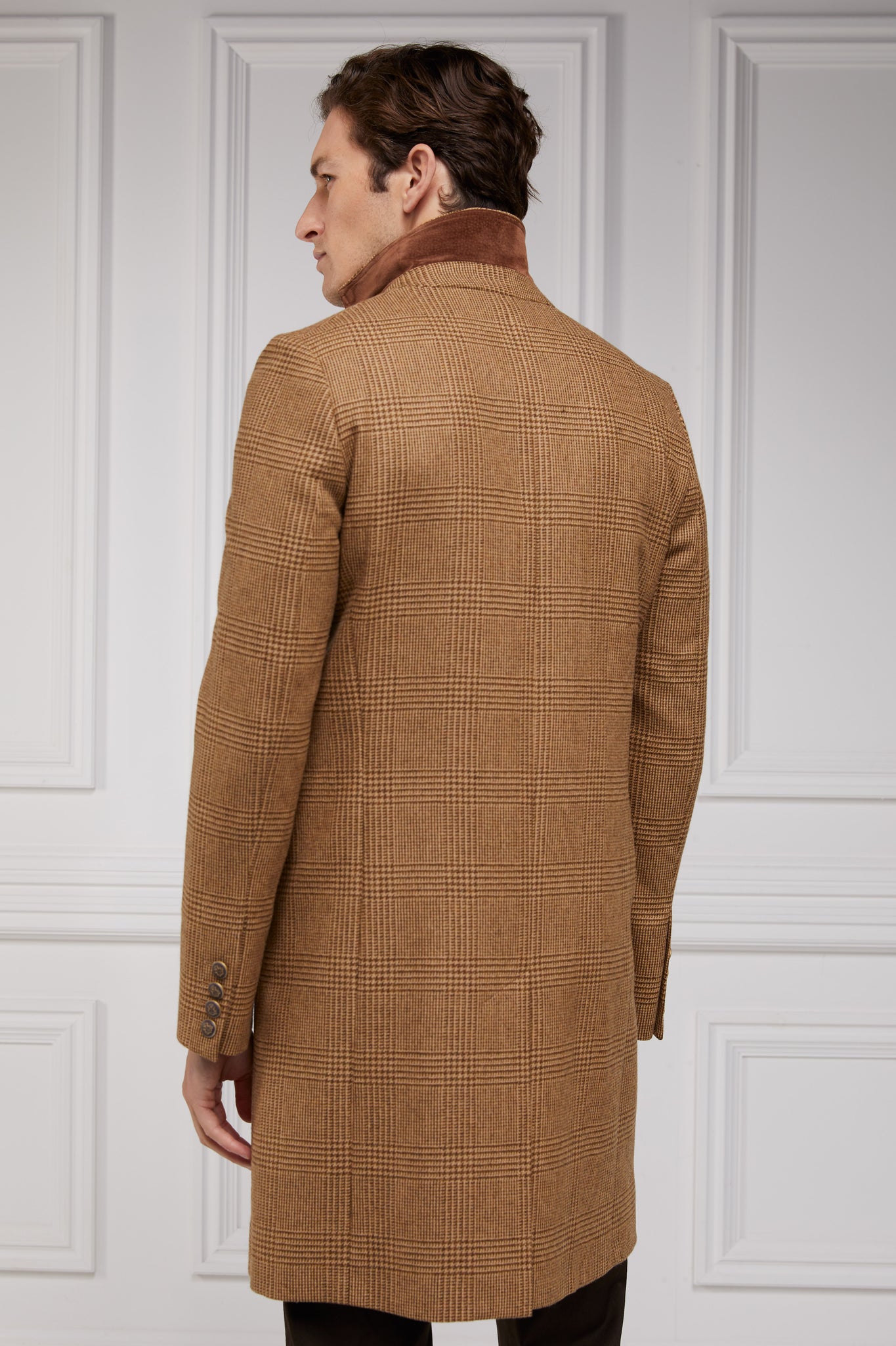 Hand crafted in the UK using the finest wools and meticulously tailored for a crisp, clean appearance, The Cheltenham Coat is the epitome of effortless style. This single-breasted mid-length coat is framed by slightly padded shoulders for a sharp silhouette, featuring classic notch lapels and horn style button fastenings. Pop the collar to reveal our hidden fabric detailing that matches the internal double-welt ticket pocket. Finished off with functional cuff button detailing and branded alloy-finish coloured buttons.