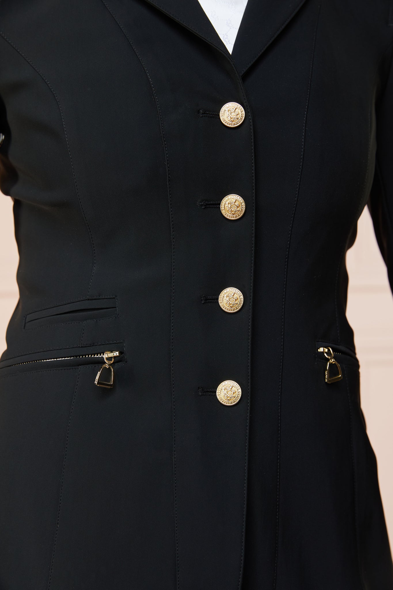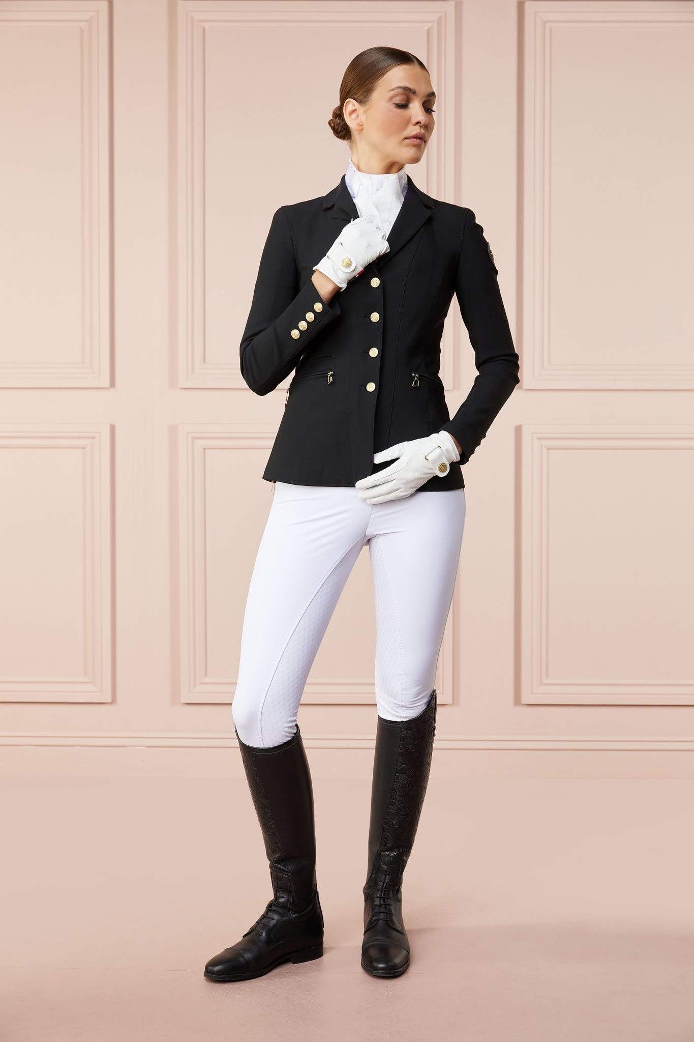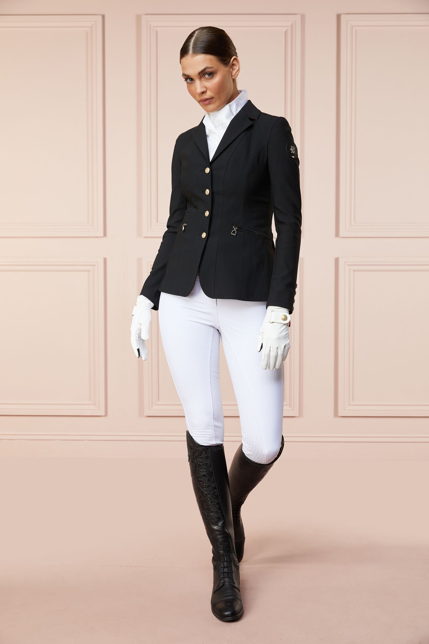Meticulously tailored for a flattering slim fit, this competition jacket is a must have for all competition riders. Constructed with a breathable mesh lining and shower-proof outer shell, we’ve ensured extra stretch for comfort whilst in the saddle. Detailed with zip closure and faux button fastening to keep you secure whilst riding, finished with HC iconic gold hardware. This jacket adheres to GB Competition Regulations.