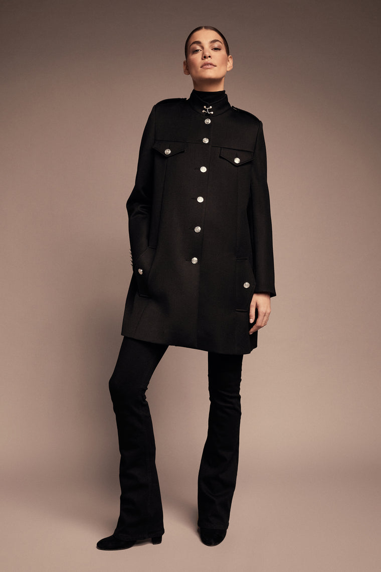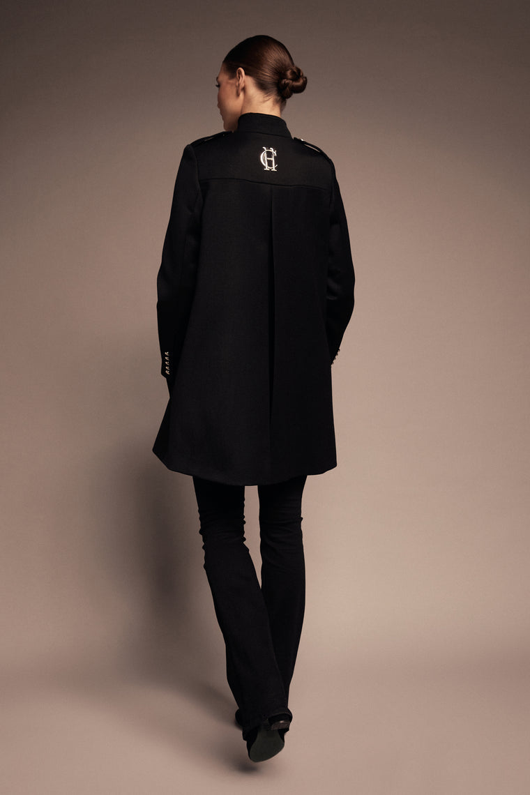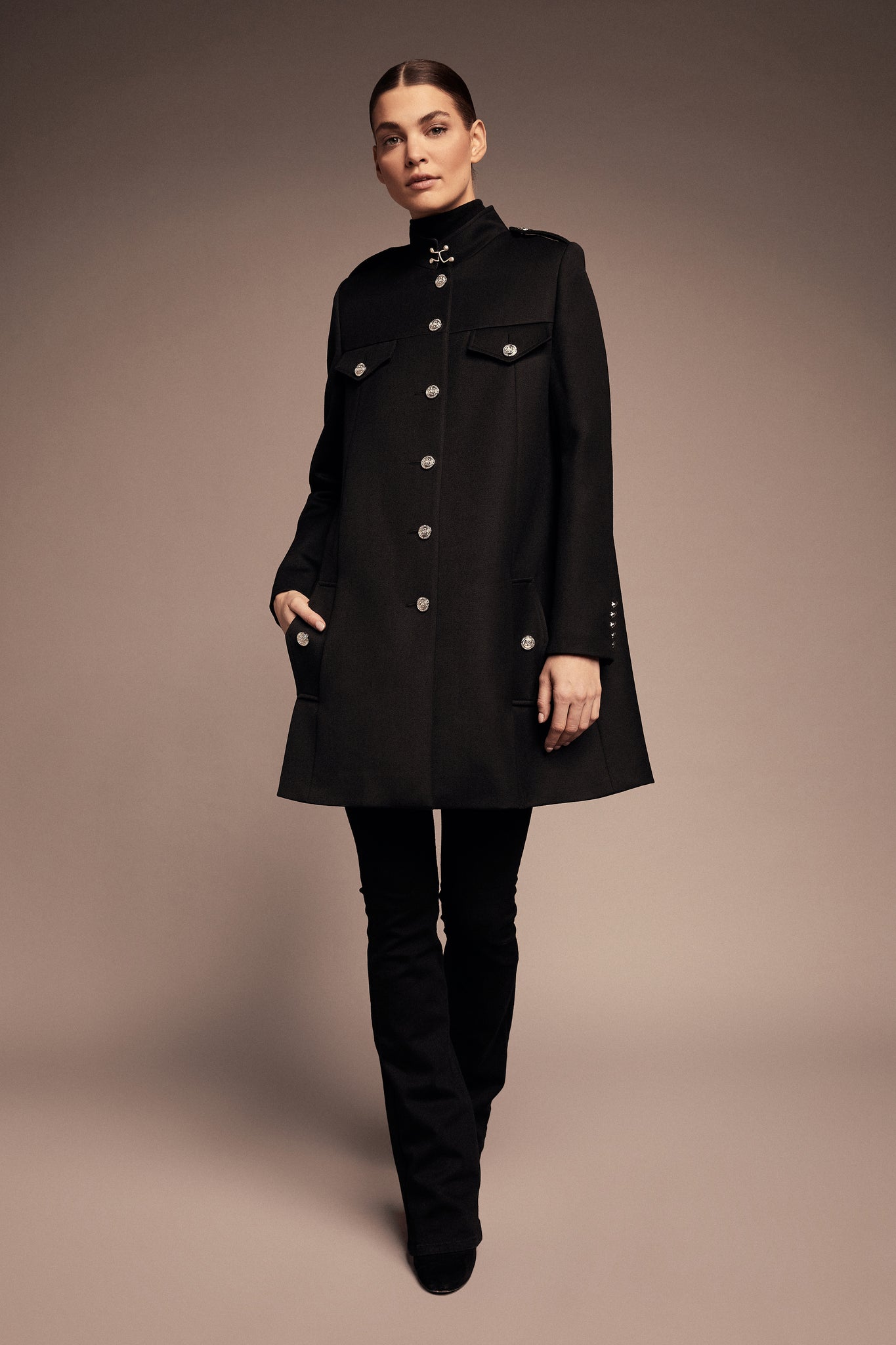 Handmade in the UK, this piece is both elegant and striking. Designed to fit like a cape with an easy fit and beautiful drape, the tailored sleeves create a sophisticated silhouette. With a wide inverted box pleat with side-entry pockets, this piece celebrates the Jubilee with its platinum-plated hardware and rich purple satin lining. Detailed with a high neck with hook and eye closure, the Jubilee Tartan collar lining adds an extra touch of elegance and style.
