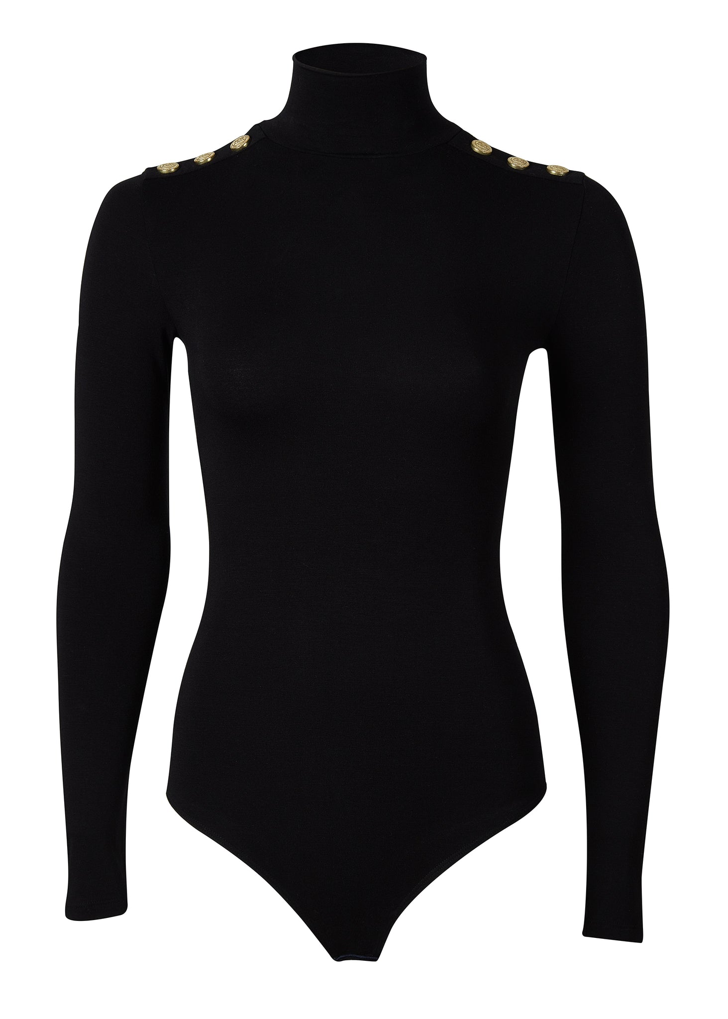 Our superior knitting technique ensures our bodies have a flawlessly smooth fit. Designed with a second-skin feel, this soft stretch bodysuit has a flattering thong brief that will remain undetectable beneath close-fitting tailoring or skirts. Due to our luxury super stretch fabric we can ensure that even those who are long in the body can be sure to have a comfortable fit. Adorned with gold HC crested rivets across the shoulders and cuffs for added style.