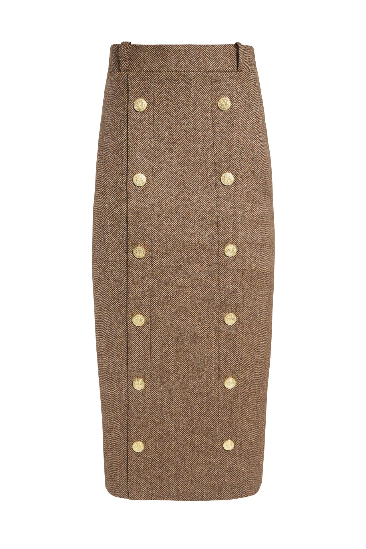 Handcrafted from the finest wool, this new addition to our skirt collection has been designed with a refined, pencil silhouette. Designed with a full satin lining and a zip back closure. With a close fit and high waist, this piece is a classic wardrobe staple. Detailed with our iconic gold hardware and statement gold buttons.