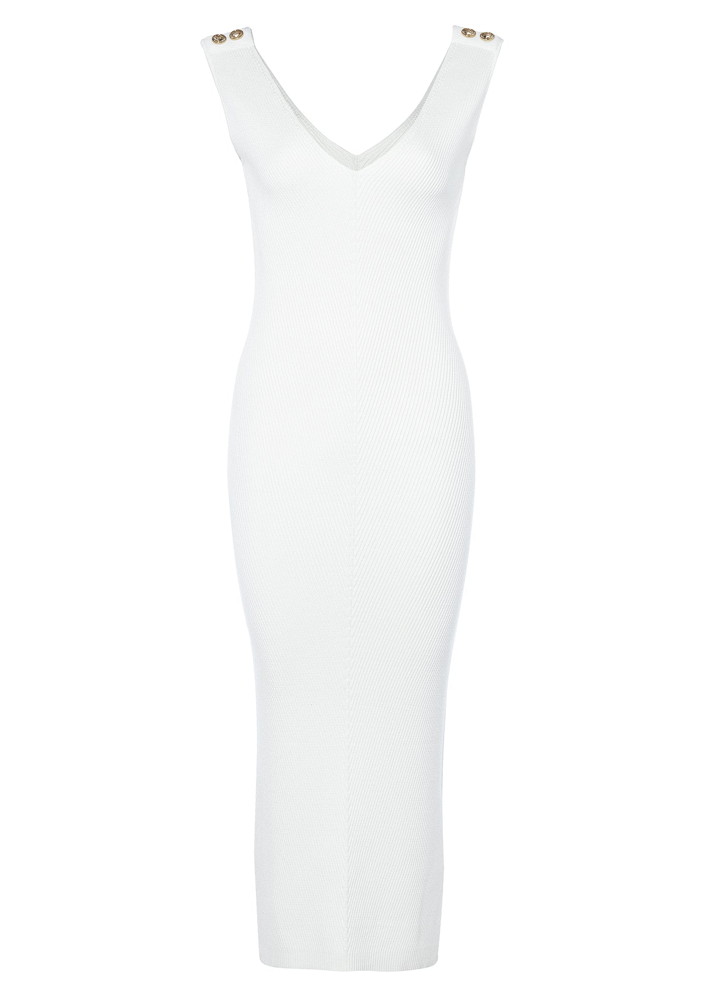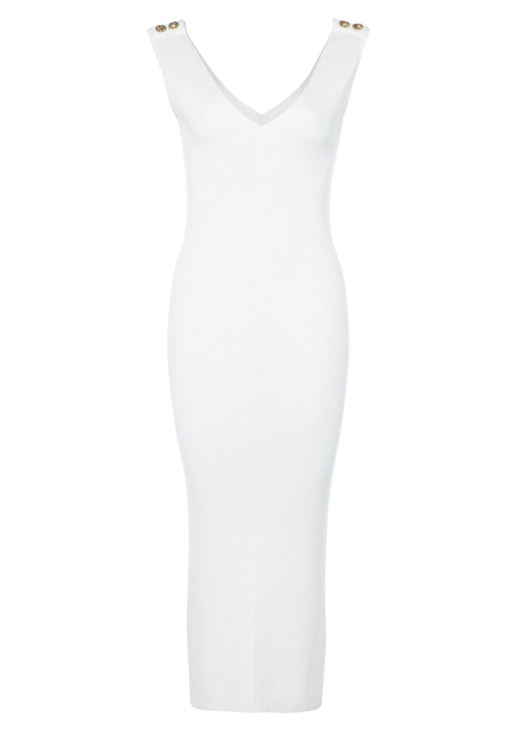 Both elegant and sophisticated, the Kensington Sleeveless Dress has been designed with a body-contouring fit. Created from a soft, ribbed fabric in a longer length and v-neck line. Detailed with our iconic hardware on the shoulders.