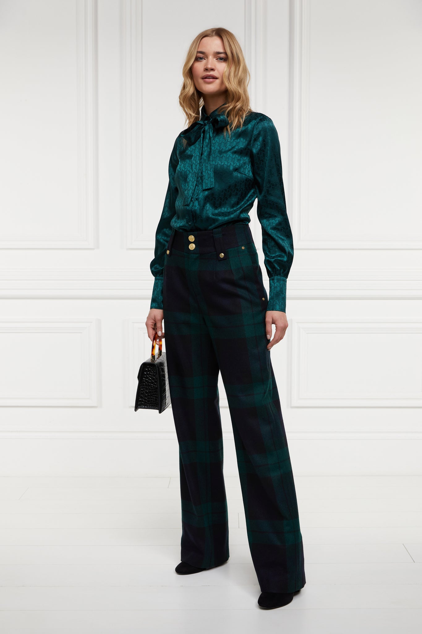 Simple and refined, these straight-leg trousers are the perfect balance of smart casual that effortlessly take you from day to night. Made from a luxurious wool blend that's fully lined, these trousers sit high on the waist with a wide waistband to create a flattering silhouette that suits all body shapes. Featuring two large side pockets and adorned with our iconic gold hardware for an added touch of luxury. These trousers have been hand cut and made in England using wool woven in the UK.
