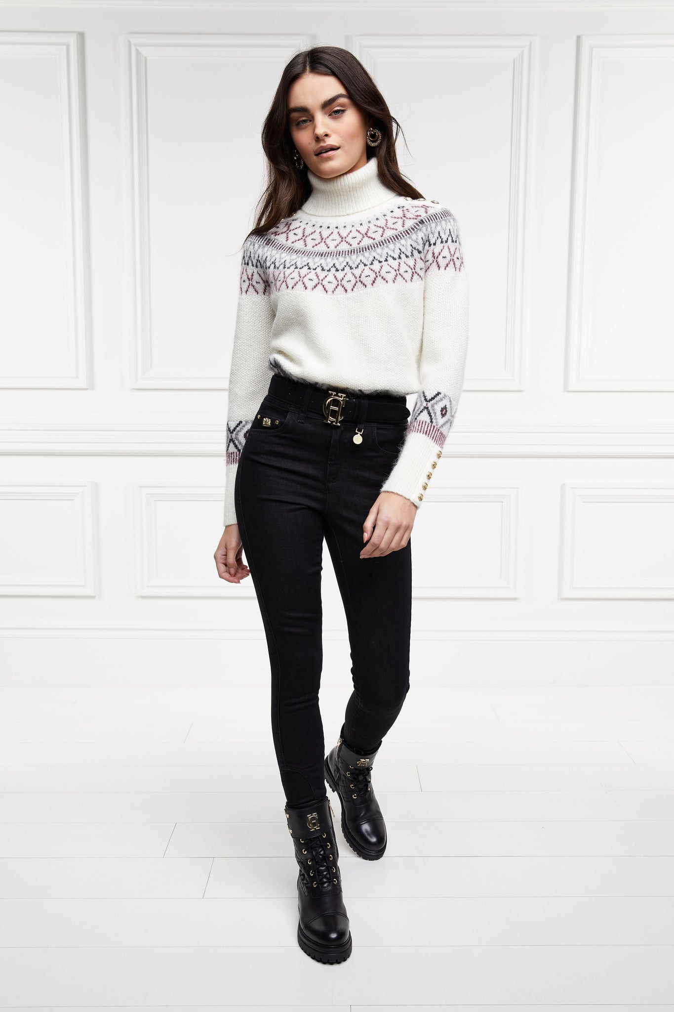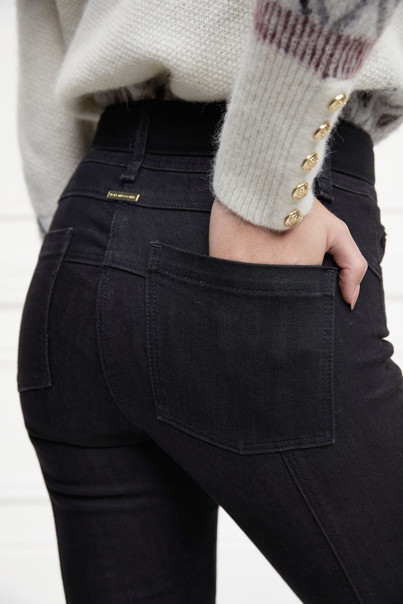gold hardware detail on back of womens high rise black denim skinny stretch thermal jean with jodhpur style seams and two open pockets to the front and back with internal fleece lining and hc gold crest on front right pocket
