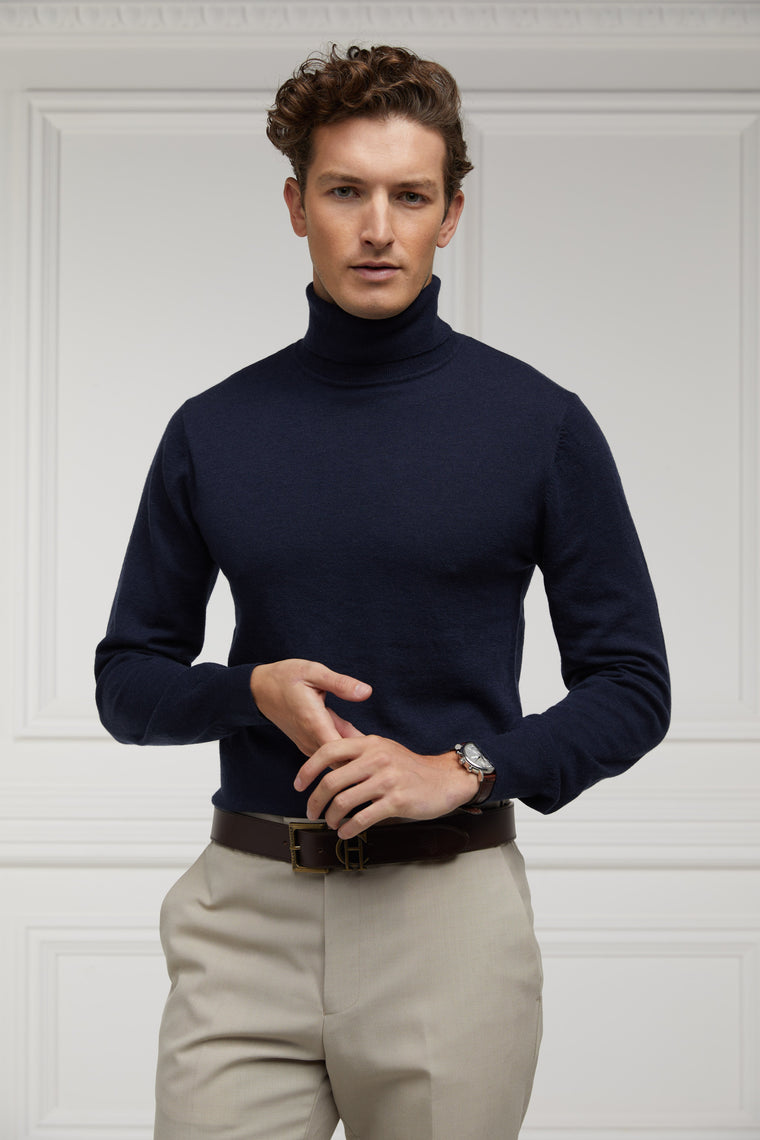 Meticulously crafted using a premium merino wool blend for an understated classic look. A wardrobe essential which exudes sophistication, this knit offers a slim fit with a ribbed hem, cuff and roll neck. The merino wool offers exceptional comfort and warmth whilst remaining breathable and lightweight. Wear alone or layer under one of our pieces of classic British tailoring.