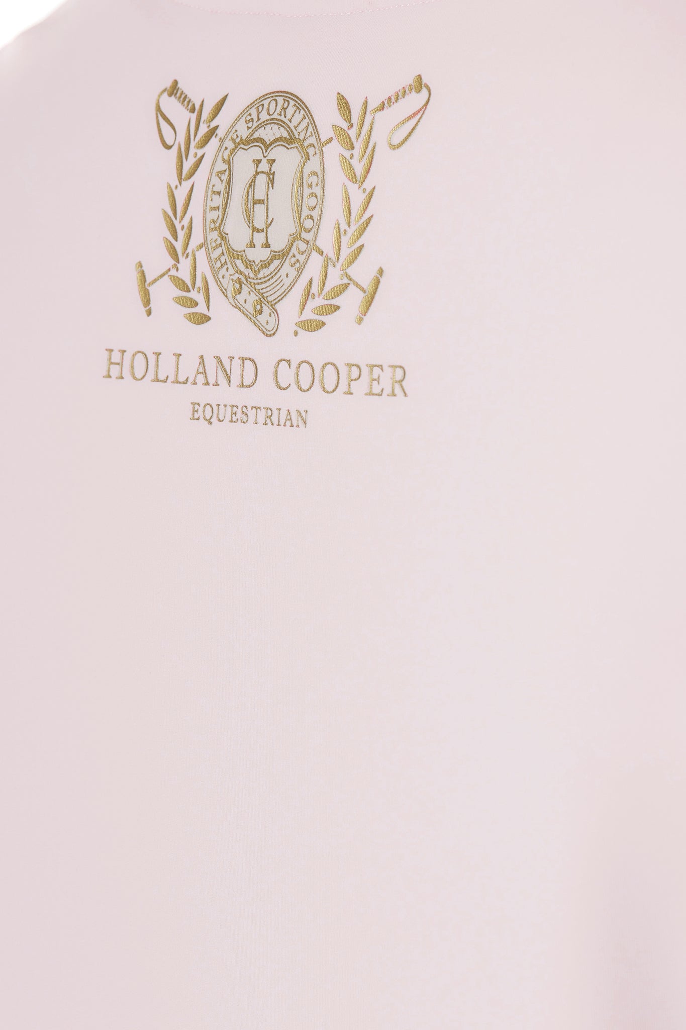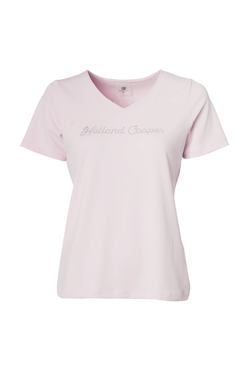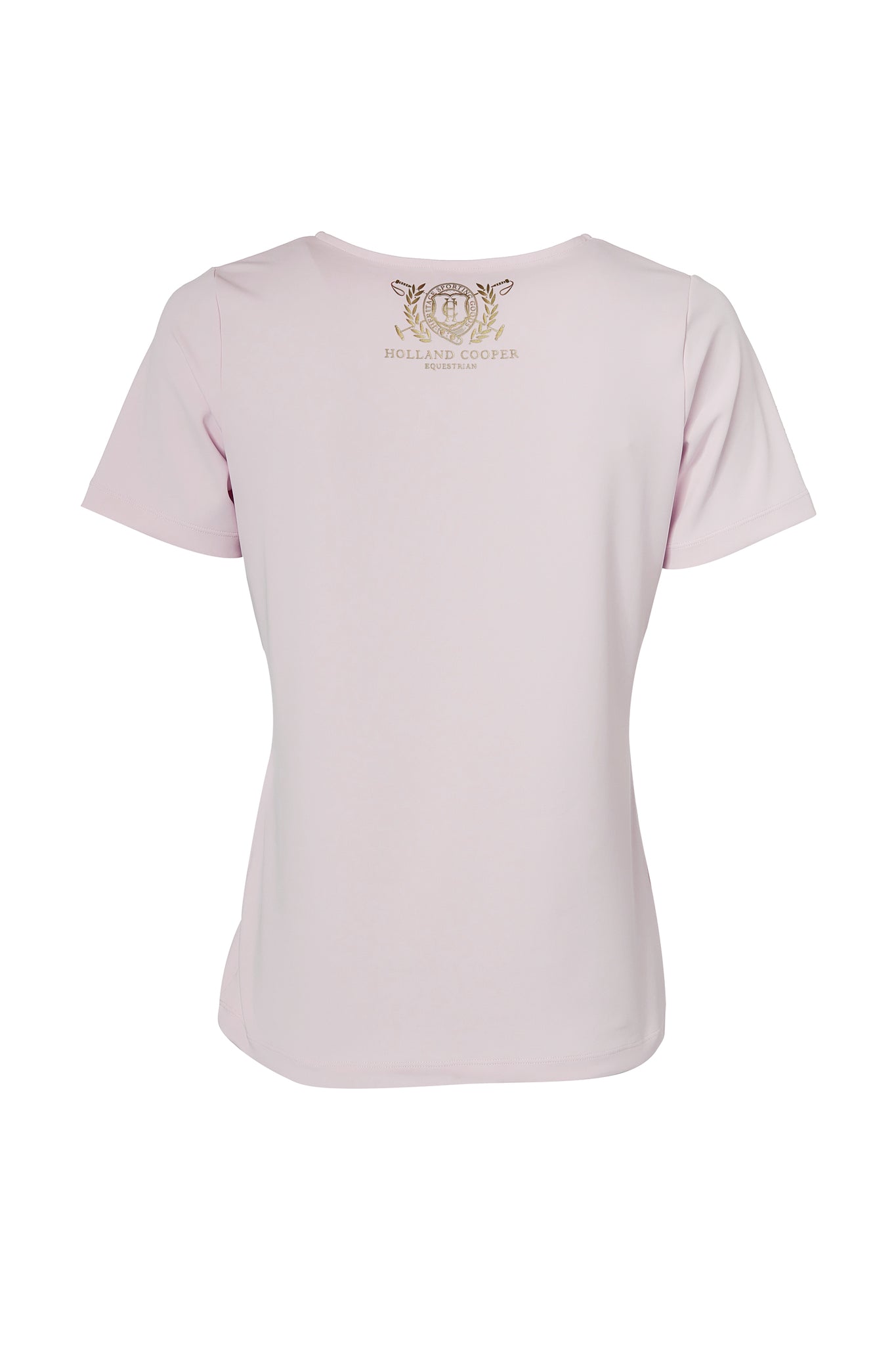 Designed for a relaxed fit, this top features a v-neckline for a flattering look. The chest is adorned with a crystal HC accent adding a touch of elegance to the simplicity. With short sleeves and a smooth, soft-touch fabric, this top is both comfortable and chic. Machine washable, making it a versatile and easy to care for riding essential.