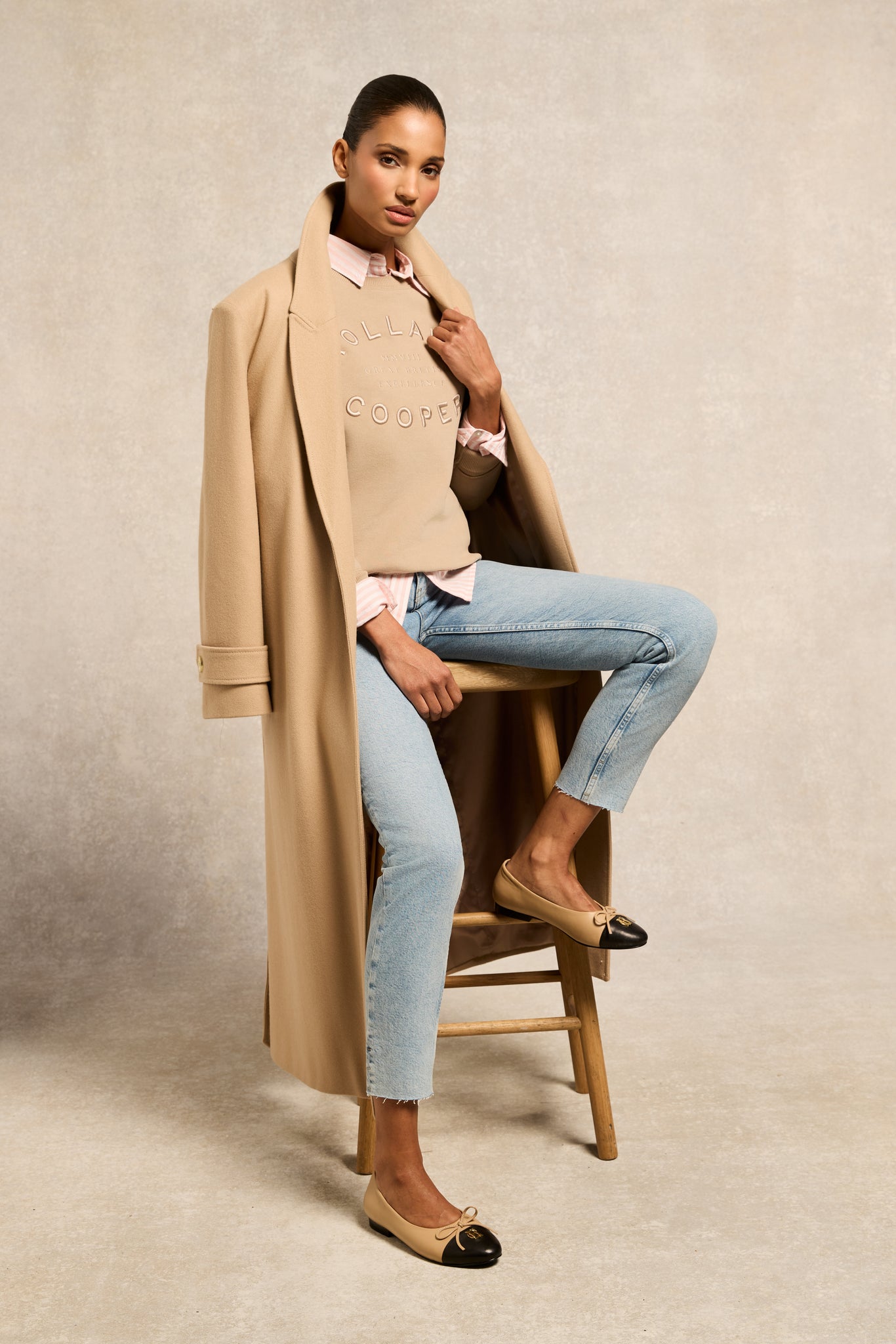This refined essential offers exceptional comfort and enduring style. The slim-fitting silhouette creates a sleek, tailored appearance, while set-in sleeves ensure a clean, sophisticated line. Detailed with our distinctive high-build embroidery and finished with luxurious ribbed texturing at the neckline and cuffs, this piece epitomises understated elegance.