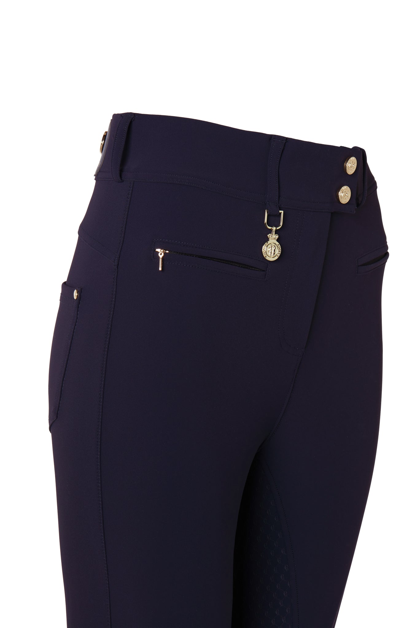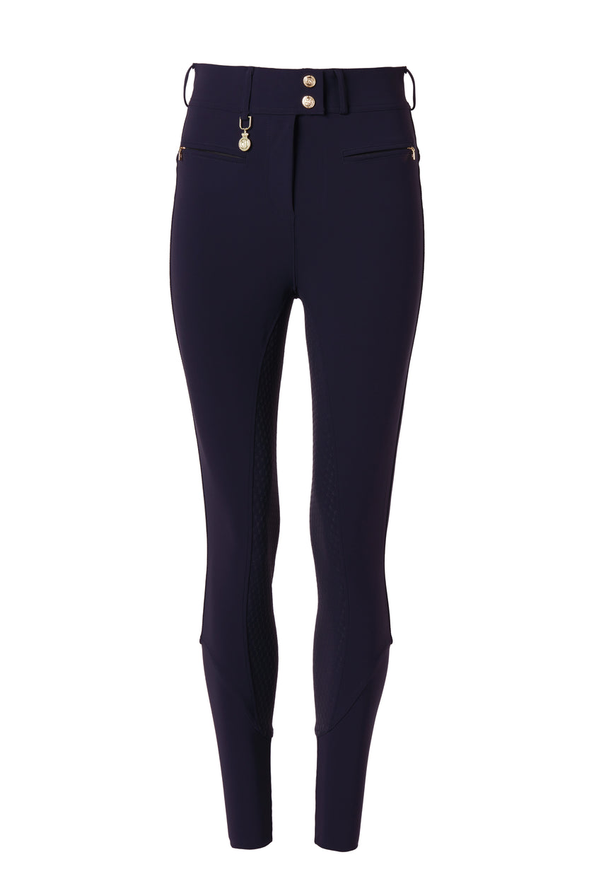 Crafted from advanced 4-way stretch nylon elastane, the Windsor Breeches provide exceptional flexibility and comfort for effortless movement in and out of the saddle. The breathable, water-repellent fabric ensures you stay dry in all weather conditions. Designed for practicality, these breeches feature an elastic inner waist tape to keep your shirt securely in place, jetted front pockets with monogrammed gold zip pullers for a touch of elegance, and a full-seat matte silicone grip print for superior stability. The back includes self-fabric patch pockets, tonal metal hardware, and a gold-branded charm, completing the meticulously crafted design. -