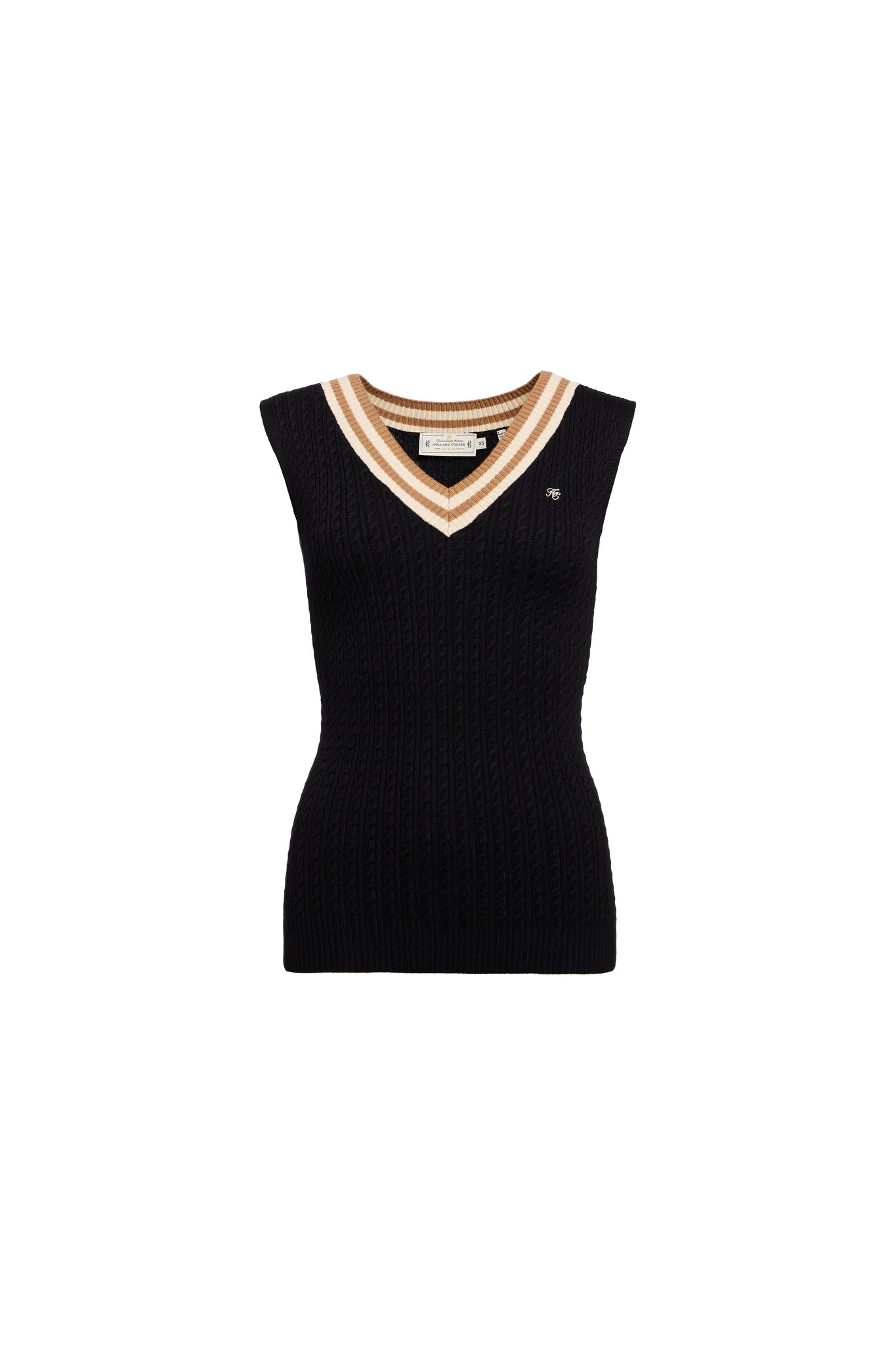 Crafted from a luxurious blend, this top offers a smooth, flattering fit that contours gracefully to the body. The design features a sophisticated play of textures with contrast rib stripes and intricate cabling throughout the body, adding a touch of classic charm. This slim-fit tank is an impeccable choice for both casual and elevated ensembles, promising versatility and style.